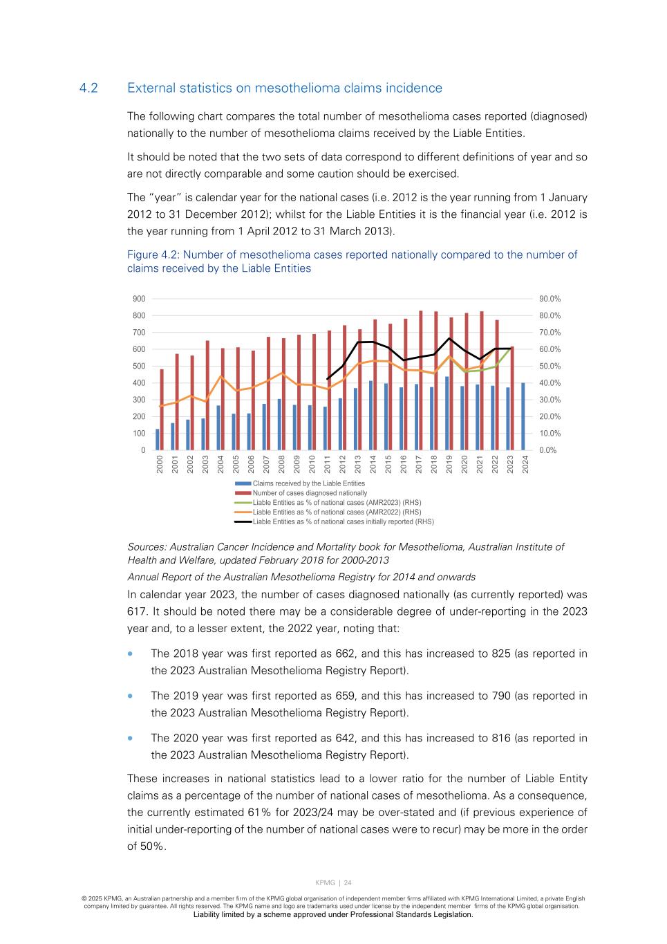 KPMG | 24 © 2025 KPMG, an Australian partnership and a member firm of the KPMG global organisation of independent member firms affiliated with KPMG International Limited, a private English company limited by guarantee. All rights reserved. The KPMG name and logo are trademarks used under license by the independent member firms of the KPMG global organisation. Liability limited by a scheme approved under Professional Standards Legislation. 4.2 External statistics on mesothelioma claims incidence The following chart compares the total number of mesothelioma cases reported (diagnosed) nationally to the number of mesothelioma claims received by the Liable Entities. It should be noted that the two sets of data correspond to different definitions of year and so are not directly comparable and some caution should be exercised. The “year” is calendar year for the national cases (i.e. 2012 is the year running from 1 January 2012 to 31 December 2012); whilst for the Liable Entities it is the financial year (i.e. 2012 is the year running from 1 April 2012 to 31 March 2013). Figure 4.2: Number of mesothelioma cases reported nationally compared to the number of claims received by the Liable Entities Sources: Australian Cancer Incidence and Mortality book for Mesothelioma, Australian Institute of Health and Welfare, updated February 2018 for 2000-2013 Annual Report of the Australian Mesothelioma Registry for 2014 and onwards In calendar year 2023, the number of cases diagnosed nationally (as currently reported) was 617. It should be noted there may be a considerable degree of under-reporting in the 2023 year and, to a lesser extent, the 2022 year, noting that: • The 2018 year was first reported as 662, and this has increased to 825 (as reported in the 2023 Australian Mesothelioma Registry Report). • The 2019 year was first reported as 659, and this has increased to 790 (as reported in the 2023 Australian Mesothelioma Registry Report). • The 2020 year was first reported as 642, and this has increased to 816 (as reported in the 2023 Australian Mesothelioma Registry Report). These increases in national statistics lead to a lower ratio for the number of Liable Entity claims as a percentage of the number of national cases of mesothelioma. As a consequence, the currently estimated 61% for 2023/24 may be over-stated and (if previous experience of initial under-reporting of the number of national cases were to recur) may be more in the order of 50%. 0.0% 10.0% 20.0% 30.0% 40.0% 50.0% 60.0% 70.0% 80.0% 90.0% 0 100 200 300 400 500 600 700 800 900 20 00 20 01 20 02 20 03 20 04 20 05 20 06 20 07 20 08 20 09 20 10 20 11 20 12 20 13 20 14 20 15 20 16 20 17 20 18 20 19 20 20 20 21 20 22 20 23 20 24 Claims received by the Liable Entities Number of cases diagnosed nationally Liable Entities as % of national cases (AMR2023) (RHS) Liable Entities as % of national cases (AMR2022) (RHS) Liable Entities as % of national cases initially reported (RHS)