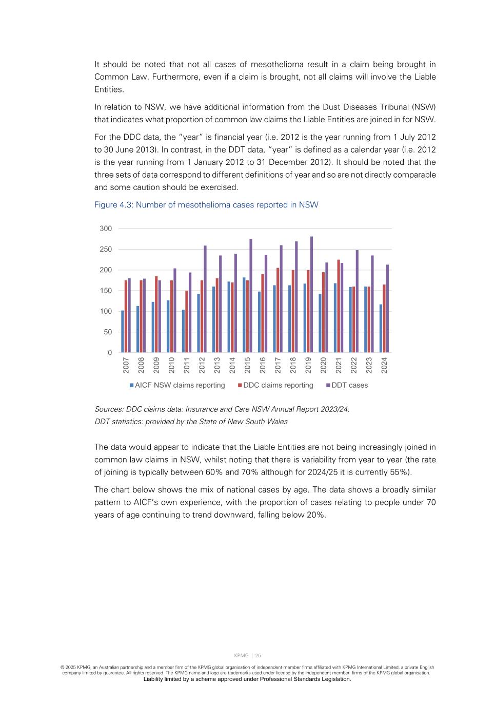 KPMG | 25 © 2025 KPMG, an Australian partnership and a member firm of the KPMG global organisation of independent member firms affiliated with KPMG International Limited, a private English company limited by guarantee. All rights reserved. The KPMG name and logo are trademarks used under license by the independent member firms of the KPMG global organisation. Liability limited by a scheme approved under Professional Standards Legislation. It should be noted that not all cases of mesothelioma result in a claim being brought in Common Law. Furthermore, even if a claim is brought, not all claims will involve the Liable Entities. In relation to NSW, we have additional information from the Dust Diseases Tribunal (NSW) that indicates what proportion of common law claims the Liable Entities are joined in for NSW. For the DDC data, the “year” is financial year (i.e. 2012 is the year running from 1 July 2012 to 30 June 2013). In contrast, in the DDT data, “year” is defined as a calendar year (i.e. 2012 is the year running from 1 January 2012 to 31 December 2012). It should be noted that the three sets of data correspond to different definitions of year and so are not directly comparable and some caution should be exercised. Figure 4.3: Number of mesothelioma cases reported in NSW Sources: DDC claims data: Insurance and Care NSW Annual Report 2023/24. DDT statistics: provided by the State of New South Wales The data would appear to indicate that the Liable Entities are not being increasingly joined in common law claims in NSW, whilst noting that there is variability from year to year (the rate of joining is typically between 60% and 70% although for 2024/25 it is currently 55%). The chart below shows the mix of national cases by age. The data shows a broadly similar pattern to AICF’s own experience, with the proportion of cases relating to people under 70 years of age continuing to trend downward, falling below 20%. 0 50 100 150 200 250 300 20 07 20 08 20 09 20 10 20 11 20 12 20 13 20 14 20 15 20 16 20 17 20 18 20 19 20 20 20 21 20 22 20 23 20 24 AICF NSW claims reporting DDC claims reporting DDT cases