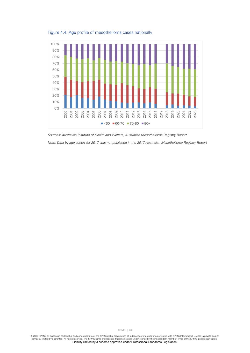 KPMG | 26 © 2025 KPMG, an Australian partnership and a member firm of the KPMG global organisation of independent member firms affiliated with KPMG International Limited, a private English company limited by guarantee. All rights reserved. The KPMG name and logo are trademarks used under license by the independent member firms of the KPMG global organisation. Liability limited by a scheme approved under Professional Standards Legislation. Figure 4.4: Age profile of mesothelioma cases nationally Sources: Australian Institute of Health and Welfare; Australian Mesothelioma Registry Report Note: Data by age cohort for 2017 was not published in the 2017 Australian Mesothelioma Registry Report 0% 10% 20% 30% 40% 50% 60% 70% 80% 90% 100% 20 00 20 01 20 02 20 03 20 04 20 05 20 06 20 07 20 08 20 09 20 10 20 11 20 12 20 13 20 14 20 15 20 16 20 17 20 18 20 19 20 20 20 21 20 22 20 23 <60 60-70 70-80 80+