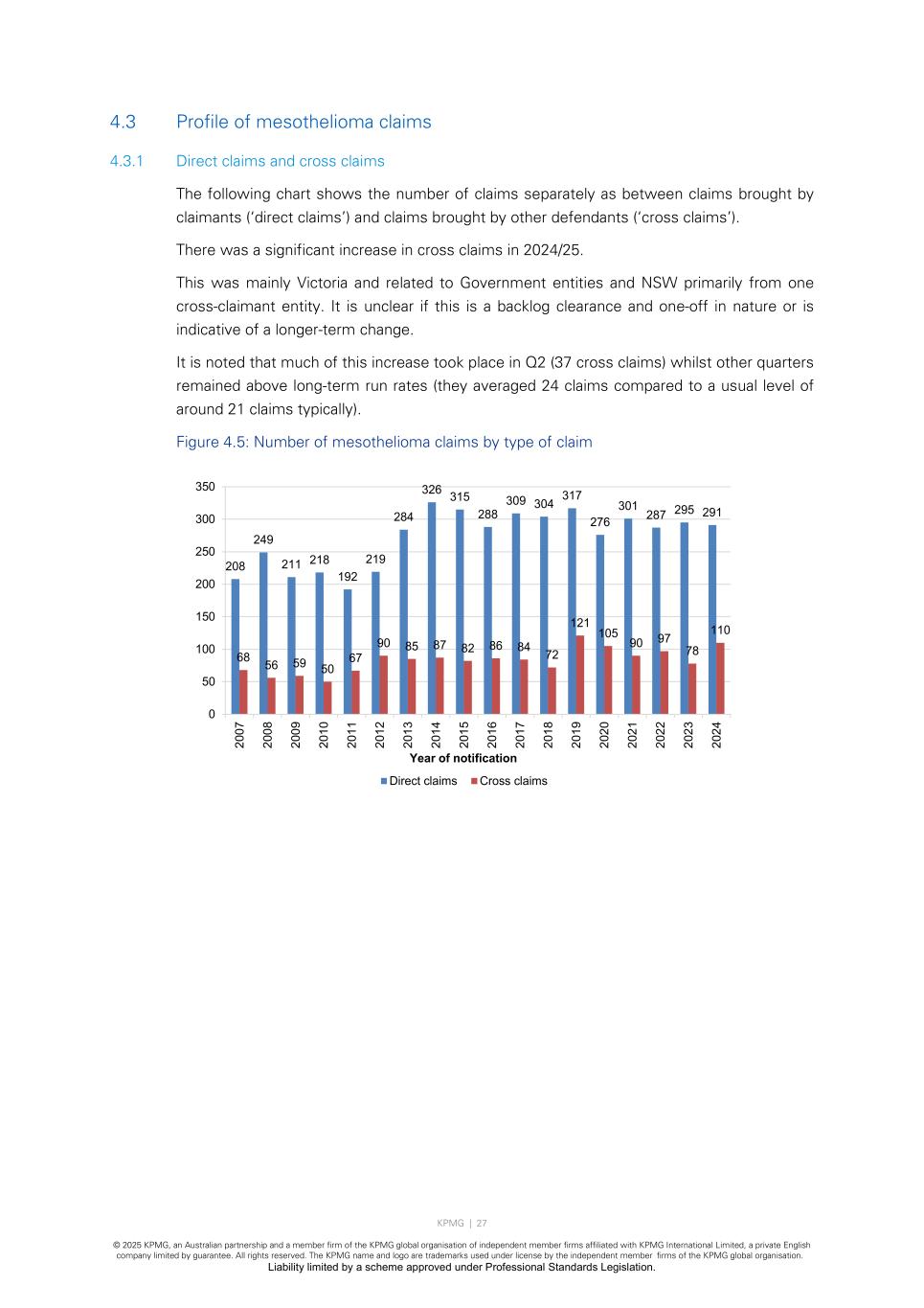 KPMG | 27 © 2025 KPMG, an Australian partnership and a member firm of the KPMG global organisation of independent member firms affiliated with KPMG International Limited, a private English company limited by guarantee. All rights reserved. The KPMG name and logo are trademarks used under license by the independent member firms of the KPMG global organisation. Liability limited by a scheme approved under Professional Standards Legislation. 4.3 Profile of mesothelioma claims 4.3.1 Direct claims and cross claims The following chart shows the number of claims separately as between claims brought by claimants (‘direct claims’) and claims brought by other defendants (‘cross claims’). There was a significant increase in cross claims in 2024/25. This was mainly Victoria and related to Government entities and NSW primarily from one cross-claimant entity. It is unclear if this is a backlog clearance and one-off in nature or is indicative of a longer-term change. It is noted that much of this increase took place in Q2 (37 cross claims) whilst other quarters remained above long-term run rates (they averaged 24 claims compared to a usual level of around 21 claims typically). Figure 4.5: Number of mesothelioma claims by type of claim 208 249 211 218 192 219 284 326 315 288 309 304 317 276 301 287 295 291 68 56 59 50 67 90 85 87 82 86 84 72 121 105 90 97 78 110 0 50 100 150 200 250 300 350 20 07 20 08 20 09 20 10 20 11 20 12 20 13 20 14 20 15 20 16 20 17 20 18 20 19 20 20 20 21 20 22 20 23 20 24 Year of notification Direct claims Cross claims