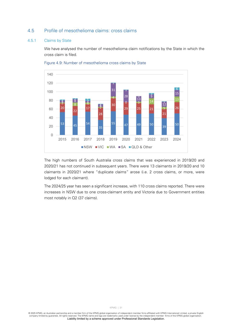 KPMG | 31 © 2025 KPMG, an Australian partnership and a member firm of the KPMG global organisation of independent member firms affiliated with KPMG International Limited, a private English company limited by guarantee. All rights reserved. The KPMG name and logo are trademarks used under license by the independent member firms of the KPMG global organisation. Liability limited by a scheme approved under Professional Standards Legislation. 4.5 Profile of mesothelioma claims: cross claims 4.5.1 Claims by State We have analysed the number of mesothelioma claim notifications by the State in which the cross claim is filed. Figure 4.9: Number of mesothelioma cross claims by State The high numbers of South Australia cross claims that was experienced in 2019/20 and 2020/21 has not continued in subsequent years. There were 13 claimants in 2019/20 and 10 claimants in 2020/21 where “duplicate claims” arose (i.e. 2 cross claims, or more, were lodged for each claimant). The 2024/25 year has seen a significant increase, with 110 cross claims reported. There were increases in NSW due to one cross-claimant entity and Victoria due to Government entities most notably in Q2 (37 claims). 53 45 54 35 55 47 49 50 39 50 20 22 17 28 30 29 25 21 21 26 2 8 4 2 4 0 3 14 5 135 8 4 6 31 28 13 9 12 15 2 2 5 1 1 1 0 3 1 6 0 20 40 60 80 100 120 140 2015 2016 2017 2018 2019 2020 2021 2022 2023 2024 NSW VIC WA SA QLD & Other