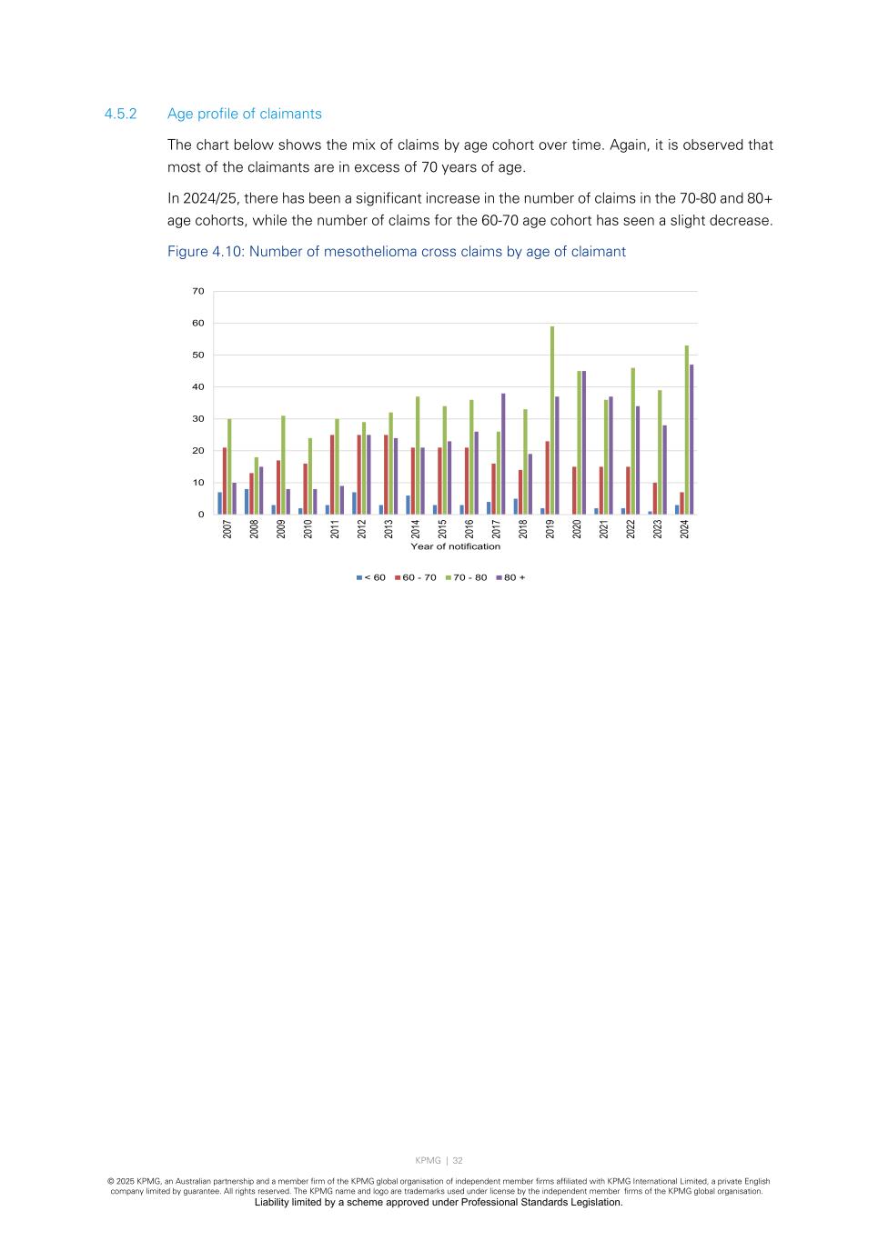 KPMG | 32 © 2025 KPMG, an Australian partnership and a member firm of the KPMG global organisation of independent member firms affiliated with KPMG International Limited, a private English company limited by guarantee. All rights reserved. The KPMG name and logo are trademarks used under license by the independent member firms of the KPMG global organisation. Liability limited by a scheme approved under Professional Standards Legislation. 4.5.2 Age profile of claimants The chart below shows the mix of claims by age cohort over time. Again, it is observed that most of the claimants are in excess of 70 years of age. In 2024/25, there has been a significant increase in the number of claims in the 70-80 and 80+ age cohorts, while the number of claims for the 60-70 age cohort has seen a slight decrease. Figure 4.10: Number of mesothelioma cross claims by age of claimant 0 10 20 30 40 50 60 70 20 07 20 08 20 09 20 10 20 11 20 12 20 13 20 14 20 15 20 16 20 17 20 18 20 19 20 20 20 21 20 22 20 23 20 24 Year of notification < 60 60 - 70 70 - 80 80 +