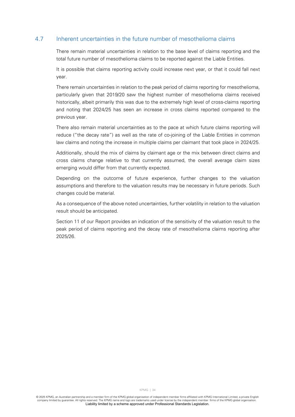 KPMG | 34 © 2025 KPMG, an Australian partnership and a member firm of the KPMG global organisation of independent member firms affiliated with KPMG International Limited, a private English company limited by guarantee. All rights reserved. The KPMG name and logo are trademarks used under license by the independent member firms of the KPMG global organisation. Liability limited by a scheme approved under Professional Standards Legislation. 4.7 Inherent uncertainties in the future number of mesothelioma claims There remain material uncertainties in relation to the base level of claims reporting and the total future number of mesothelioma claims to be reported against the Liable Entities. It is possible that claims reporting activity could increase next year, or that it could fall next year. There remain uncertainties in relation to the peak period of claims reporting for mesothelioma, particularly given that 2019/20 saw the highest number of mesothelioma claims received historically, albeit primarily this was due to the extremely high level of cross-claims reporting and noting that 2024/25 has seen an increase in cross claims reported compared to the previous year. There also remain material uncertainties as to the pace at which future claims reporting will reduce (“the decay rate”) as well as the rate of co-joining of the Liable Entities in common law claims and noting the increase in multiple claims per claimant that took place in 2024/25. Additionally, should the mix of claims by claimant age or the mix between direct claims and cross claims change relative to that currently assumed, the overall average claim sizes emerging would differ from that currently expected. Depending on the outcome of future experience, further changes to the valuation assumptions and therefore to the valuation results may be necessary in future periods. Such changes could be material. As a consequence of the above noted uncertainties, further volatility in relation to the valuation result should be anticipated. Section 11 of our Report provides an indication of the sensitivity of the valuation result to the peak period of claims reporting and the decay rate of mesothelioma claims reporting after 2025/26.