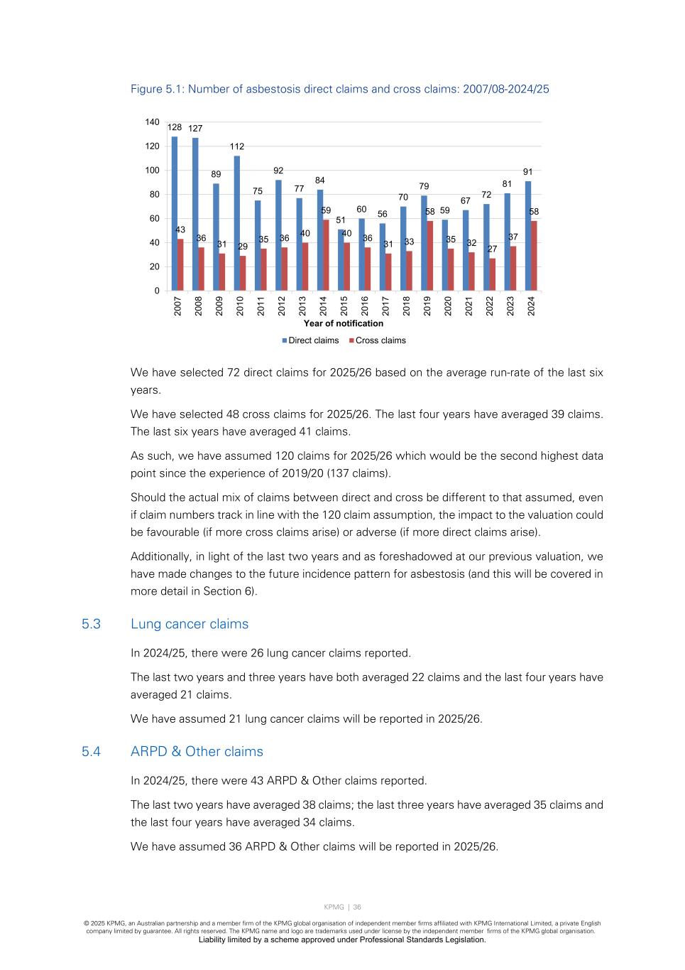 KPMG | 36 © 2025 KPMG, an Australian partnership and a member firm of the KPMG global organisation of independent member firms affiliated with KPMG International Limited, a private English company limited by guarantee. All rights reserved. The KPMG name and logo are trademarks used under license by the independent member firms of the KPMG global organisation. Liability limited by a scheme approved under Professional Standards Legislation. Figure 5.1: Number of asbestosis direct claims and cross claims: 2007/08-2024/25 We have selected 72 direct claims for 2025/26 based on the average run-rate of the last six years. We have selected 48 cross claims for 2025/26. The last four years have averaged 39 claims. The last six years have averaged 41 claims. As such, we have assumed 120 claims for 2025/26 which would be the second highest data point since the experience of 2019/20 (137 claims). Should the actual mix of claims between direct and cross be different to that assumed, even if claim numbers track in line with the 120 claim assumption, the impact to the valuation could be favourable (if more cross claims arise) or adverse (if more direct claims arise). Additionally, in light of the last two years and as foreshadowed at our previous valuation, we have made changes to the future incidence pattern for asbestosis (and this will be covered in more detail in Section 6). 5.3 Lung cancer claims In 2024/25, there were 26 lung cancer claims reported. The last two years and three years have both averaged 22 claims and the last four years have averaged 21 claims. We have assumed 21 lung cancer claims will be reported in 2025/26. 5.4 ARPD & Other claims In 2024/25, there were 43 ARPD & Other claims reported. The last two years have averaged 38 claims; the last three years have averaged 35 claims and the last four years have averaged 34 claims. We have assumed 36 ARPD & Other claims will be reported in 2025/26. 128 127 89 112 75 92 77 84 51 60 56 70 79 59 67 72 81 91 43 36 31 29 35 36 40 59 40 36 31 33 58 35 32 27 37 58 0 20 40 60 80 100 120 140 20 07 20 08 20 09 20 10 20 11 20 12 20 13 20 14 20 15 20 16 20 17 20 18 20 19 20 20 20 21 20 22 20 23 20 24 Year of notification Direct claims Cross claims