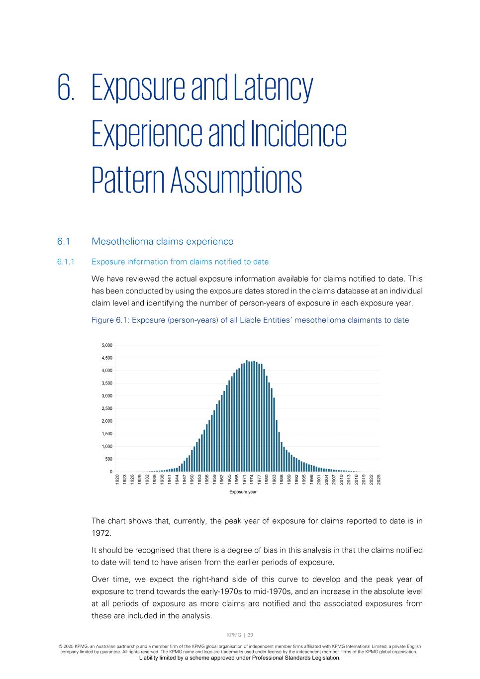 KPMG | 39 © 2025 KPMG, an Australian partnership and a member firm of the KPMG global organisation of independent member firms affiliated with KPMG International Limited, a private English company limited by guarantee. All rights reserved. The KPMG name and logo are trademarks used under license by the independent member firms of the KPMG global organisation. Liability limited by a scheme approved under Professional Standards Legislation. 6. Exposure and Latency Experience and Incidence Pattern Assumptions 6.1 Mesothelioma claims experience 6.1.1 Exposure information from claims notified to date We have reviewed the actual exposure information available for claims notified to date. This has been conducted by using the exposure dates stored in the claims database at an individual claim level and identifying the number of person-years of exposure in each exposure year. Figure 6.1: Exposure (person-years) of all Liable Entities’ mesothelioma claimants to date The chart shows that, currently, the peak year of exposure for claims reported to date is in 1972. It should be recognised that there is a degree of bias in this analysis in that the claims notified to date will tend to have arisen from the earlier periods of exposure. Over time, we expect the right-hand side of this curve to develop and the peak year of exposure to trend towards the early-1970s to mid-1970s, and an increase in the absolute level at all periods of exposure as more claims are notified and the associated exposures from these are included in the analysis. 0 500 1,000 1,500 2,000 2,500 3,000 3,500 4,000 4,500 5,000 19 20 19 23 19 26 19 29 19 32 19 35 19 38 19 41 19 44 19 47 19 50 19 53 19 56 19 59 19 62 19 65 19 68 19 71 19 74 19 77 19 80 19 83 19 86 19 89 19 92 19 95 19 98 20 01 20 04 20 07 20 10 20 13 20 16 20 19 20 22 20 25 Exposure year