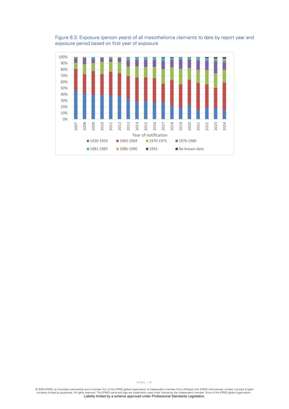 KPMG | 41 © 2025 KPMG, an Australian partnership and a member firm of the KPMG global organisation of independent member firms affiliated with KPMG International Limited, a private English company limited by guarantee. All rights reserved. The KPMG name and logo are trademarks used under license by the independent member firms of the KPMG global organisation. Liability limited by a scheme approved under Professional Standards Legislation. Figure 6.3: Exposure (person years) of all mesothelioma claimants to date by report year and exposure period based on first year of exposure 0% 10% 20% 30% 40% 50% 60% 70% 80% 90% 100% 20 07 20 08 20 09 20 10 20 11 20 12 20 13 20 14 20 15 20 16 20 17 20 18 20 19 20 20 20 21 20 22 20 23 20 24 Year of notification 1920-1959 1960-1969 1970-1975 1976-1980 1981-1985 1986-1990 1991- No known data