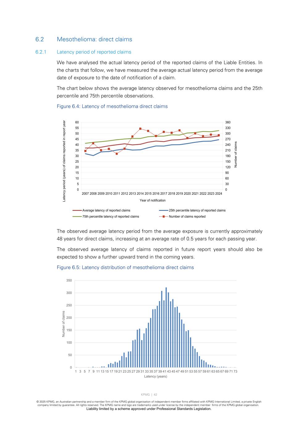 KPMG | 42 © 2025 KPMG, an Australian partnership and a member firm of the KPMG global organisation of independent member firms affiliated with KPMG International Limited, a private English company limited by guarantee. All rights reserved. The KPMG name and logo are trademarks used under license by the independent member firms of the KPMG global organisation. Liability limited by a scheme approved under Professional Standards Legislation. 6.2 Mesothelioma: direct claims 6.2.1 Latency period of reported claims We have analysed the actual latency period of the reported claims of the Liable Entities. In the charts that follow, we have measured the average actual latency period from the average date of exposure to the date of notification of a claim. The chart below shows the average latency observed for mesothelioma claims and the 25th percentile and 75th percentile observations. Figure 6.4: Latency of mesothelioma direct claims The observed average latency period from the average exposure is currently approximately 48 years for direct claims, increasing at an average rate of 0.5 years for each passing year. The observed average latency of claims reported in future report years should also be expected to show a further upward trend in the coming years. Figure 6.5: Latency distribution of mesothelioma direct claims 0 30 60 90 120 150 180 210 240 270 300 330 360 0 5 10 15 20 25 30 35 40 45 50 55 60 2007 2008 2009 2010 2011 2012 2013 2014 2015 2016 2017 2018 2019 2020 2021 2022 2023 2024 N um be r o f c la im s La te nc y pe rio d (y ea rs ) o f c la im s re po rte d in re po rt ye ar Year of notification Average latency of reported claims 25th percentile latency of reported claims 75th percentile latency of reported claims Number of claims reported 0 50 100 150 200 250 300 350 1 3 5 7 9 11 13 15 17 19 21 23 25 27 29 31 33 35 37 39 41 43 45 47 49 51 53 55 57 59 61 63 65 67 69 71 73 N um be r o f c la im s Latency (years)