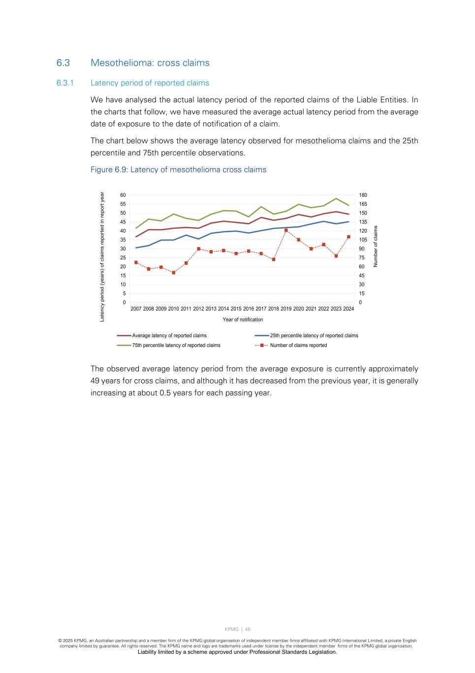 KPMG | 45 © 2025 KPMG, an Australian partnership and a member firm of the KPMG global organisation of independent member firms affiliated with KPMG International Limited, a private English company limited by guarantee. All rights reserved. The KPMG name and logo are trademarks used under license by the independent member firms of the KPMG global organisation. Liability limited by a scheme approved under Professional Standards Legislation. 6.3 Mesothelioma: cross claims 6.3.1 Latency period of reported claims We have analysed the actual latency period of the reported claims of the Liable Entities. In the charts that follow, we have measured the average actual latency period from the average date of exposure to the date of notification of a claim. The chart below shows the average latency observed for mesothelioma claims and the 25th percentile and 75th percentile observations. Figure 6.9: Latency of mesothelioma cross claims The observed average latency period from the average exposure is currently approximately 49 years for cross claims, and although it has decreased from the previous year, it is generally increasing at about 0.5 years for each passing year. 0 15 30 45 60 75 90 105 120 135 150 165 180 0 5 10 15 20 25 30 35 40 45 50 55 60 2007 2008 2009 2010 2011 2012 2013 2014 2015 2016 2017 2018 2019 2020 2021 2022 2023 2024 N um be r o f c la im s La te nc y pe rio d (y ea rs ) o f c la im s re po rte d in re po rt ye ar Year of notification Average latency of reported claims 25th percentile latency of reported claims 75th percentile latency of reported claims Number of claims reported