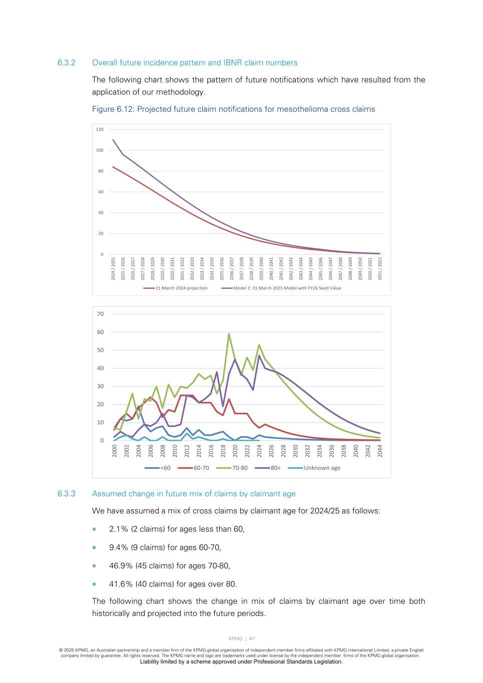 KPMG | 47 © 2025 KPMG, an Australian partnership and a member firm of the KPMG global organisation of independent member firms affiliated with KPMG International Limited, a private English company limited by guarantee. All rights reserved. The KPMG name and logo are trademarks used under license by the independent member firms of the KPMG global organisation. Liability limited by a scheme approved under Professional Standards Legislation. 6.3.2 Overall future incidence pattern and IBNR claim numbers The following chart shows the pattern of future notifications which have resulted from the application of our methodology. Figure 6.12: Projected future claim notifications for mesothelioma cross claims 6.3.3 Assumed change in future mix of claims by claimant age We have assumed a mix of cross claims by claimant age for 2024/25 as follows: • 2.1% (2 claims) for ages less than 60, • 9.4% (9 claims) for ages 60-70, • 46.9% (45 claims) for ages 70-80, • 41.6% (40 claims) for ages over 80. The following chart shows the change in mix of claims by claimant age over time both historically and projected into the future periods. 0 20 40 60 80 100 120 20 24 / 20 25 20 25 / 20 26 20 26 / 20 27 20 27 / 20 28 20 28 / 20 29 20 29 / 20 30 20 30 / 20 31 20 31 / 20 32 20 32 / 20 33 20 33 / 20 34 20 34 / 20 35 20 35 / 20 36 20 36 / 20 37 20 37 / 20 38 20 38 / 20 39 20 39 / 20 40 20 40 / 20 41 20 41 / 20 42 20 42 / 20 43 20 43 / 20 44 20 44 / 20 45 20 45 / 20 46 20 46 / 20 47 20 47 / 20 48 20 48 / 20 49 20 49 / 20 50 20 50 / 20 51 20 51 / 20 52 31 March 2024 projection Model 2: 31 March 2025 Model with FY26 Seed Value 0 10 20 30 40 50 60 70 20 00 20 02 20 04 20 06 20 08 20 10 20 12 20 14 20 16 20 18 20 20 20 22 20 24 20 26 20 28 20 30 20 32 20 34 20 36 20 38 20 40 20 42 20 44 <60 60-70 70-80 80+ Unknown age