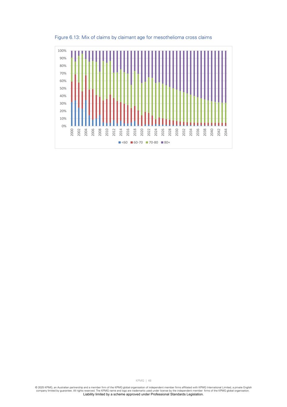 KPMG | 44 © 2025 KPMG, an Australian partnership and a member firm of the KPMG global organisation of independent member firms affiliated with KPMG International Limited, a private English company limited by guarantee. All rights reserved. The KPMG name and logo are trademarks used under license by the independent member firms of the KPMG global organisation. Liability limited by a scheme approved under Professional Standards Legislation. 6.2.3 Assumed change in future mix of claims by claimant age We have assumed a mix of direct claims by claimant age for 2025/26 as follows: • 6.4% (18 claims) for ages less than 60, • 12.8% (36 claims) for ages 60-70, • 41.1% (116 claims) for ages 70-80, • 39.7% (112 claims) for ages over 80. The following chart shows the change in mix of claims by claimant age over time both historically and projected into the future periods. Figure 6.8: Mix of claims by claimant age for mesothelioma direct claims 0 20 40 60 80 100 120 140 160 20 00 20 02 20 04 20 06 20 08 20 10 20 12 20 14 20 16 20 18 20 20 20 22 20 24 20 26 20 28 20 30 20 32 20 34 20 36 20 38 20 40 20 42 20 44 <60 60-70 70-80 80+ Unknown age 0% 10% 20% 30% 40% 50% 60% 70% 80% 90% 100% 20 00 20 02 20 04 20 06 20 08 20 10 20 12 20 14 20 16 20 18 20 20 20 22 20 24 20 26 20 28 20 30 20 32 20 34 20 36 20 38 20 40 20 42 20 44 <60 60-70 70-80 80+