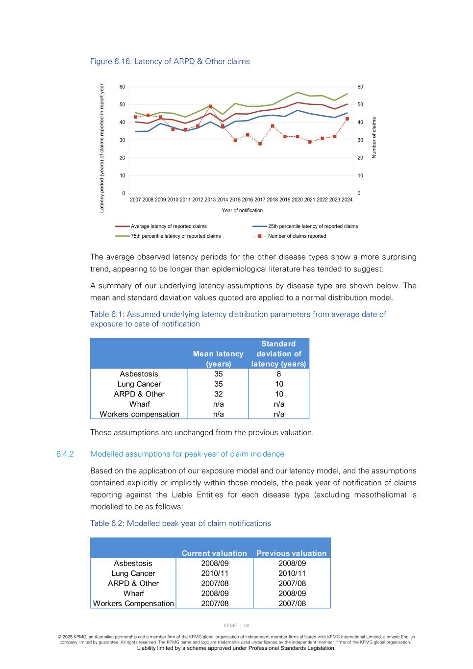 KPMG | 50 © 2025 KPMG, an Australian partnership and a member firm of the KPMG global organisation of independent member firms affiliated with KPMG International Limited, a private English company limited by guarantee. All rights reserved. The KPMG name and logo are trademarks used under license by the independent member firms of the KPMG global organisation. Liability limited by a scheme approved under Professional Standards Legislation. Figure 6.16: Latency of ARPD & Other claims The average observed latency periods for the other disease types show a more surprising trend, appearing to be longer than epidemiological literature has tended to suggest. A summary of our underlying latency assumptions by disease type are shown below. The mean and standard deviation values quoted are applied to a normal distribution model. Table 6.1: Assumed underlying latency distribution parameters from average date of exposure to date of notification These assumptions are unchanged from the previous valuation. 6.4.2 Modelled assumptions for peak year of claim incidence Based on the application of our exposure model and our latency model, and the assumptions contained explicitly or implicitly within those models, the peak year of notification of claims reporting against the Liable Entities for each disease type (excluding mesothelioma) is modelled to be as follows: Table 6.2: Modelled peak year of claim notifications 0 10 20 30 40 50 60 0 10 20 30 40 50 60 2007 2008 2009 2010 2011 2012 2013 2014 2015 2016 2017 2018 2019 2020 2021 2022 2023 2024 N um be r o f c la im s La te nc y pe rio d (y ea rs ) o f c la im s re po rte d in re po rt ye ar Year of notification Average latency of reported claims 25th percentile latency of reported claims 75th percentile latency of reported claims Number of claims reported Mean latency (years) Standard deviation of latency (years) Asbestosis 35 8 Lung Cancer 35 10 ARPD & Other 32 10 Wharf n/a n/a Workers compensation n/a n/a Current valuation Previous valuation Asbestosis 2008/09 2008/09 Lung Cancer 2010/11 2010/11 ARPD & Other 2007/08 2007/08 Wharf 2008/09 2008/09 Workers Compensation 2007/08 2007/08