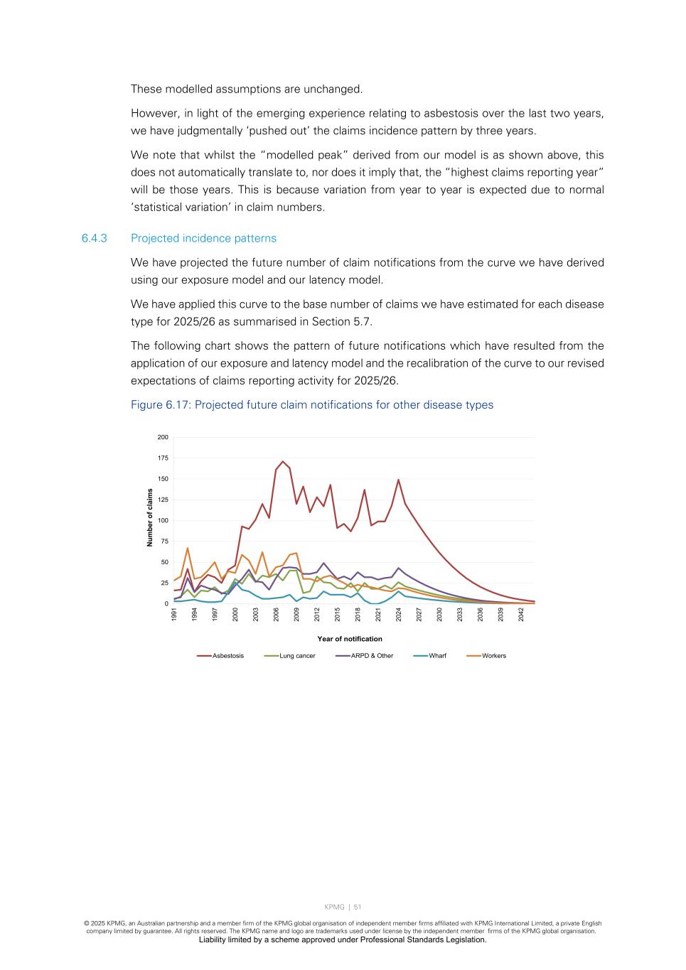 KPMG | 51 © 2025 KPMG, an Australian partnership and a member firm of the KPMG global organisation of independent member firms affiliated with KPMG International Limited, a private English company limited by guarantee. All rights reserved. The KPMG name and logo are trademarks used under license by the independent member firms of the KPMG global organisation. Liability limited by a scheme approved under Professional Standards Legislation. These modelled assumptions are unchanged. However, in light of the emerging experience relating to asbestosis over the last two years, we have judgmentally ‘pushed out’ the claims incidence pattern by three years. We note that whilst the “modelled peak” derived from our model is as shown above, this does not automatically translate to, nor does it imply that, the “highest claims reporting year” will be those years. This is because variation from year to year is expected due to normal ‘statistical variation’ in claim numbers. 6.4.3 Projected incidence patterns We have projected the future number of claim notifications from the curve we have derived using our exposure model and our latency model. We have applied this curve to the base number of claims we have estimated for each disease type for 2025/26 as summarised in Section 5.7. The following chart shows the pattern of future notifications which have resulted from the application of our exposure and latency model and the recalibration of the curve to our revised expectations of claims reporting activity for 2025/26. Figure 6.17: Projected future claim notifications for other disease types 0 25 50 75 100 125 150 175 200 19 91 19 94 19 97 20 00 20 03 20 06 20 09 20 12 20 15 20 18 20 21 20 24 20 27 20 30 20 33 20 36 20 39 20 42 Nu m be r o f c la im s Year of notification Asbestosis Lung cancer ARPD & Other Wharf Workers