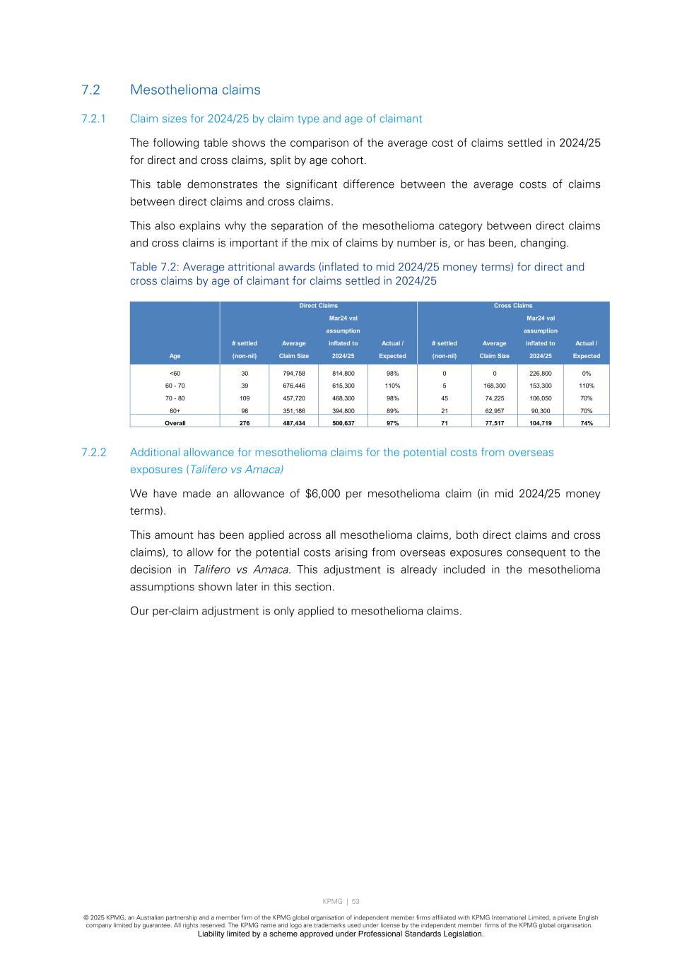 KPMG | 53 © 2025 KPMG, an Australian partnership and a member firm of the KPMG global organisation of independent member firms affiliated with KPMG International Limited, a private English company limited by guarantee. All rights reserved. The KPMG name and logo are trademarks used under license by the independent member firms of the KPMG global organisation. Liability limited by a scheme approved under Professional Standards Legislation. 7.2 Mesothelioma claims 7.2.1 Claim sizes for 2024/25 by claim type and age of claimant The following table shows the comparison of the average cost of claims settled in 2024/25 for direct and cross claims, split by age cohort. This table demonstrates the significant difference between the average costs of claims between direct claims and cross claims. This also explains why the separation of the mesothelioma category between direct claims and cross claims is important if the mix of claims by number is, or has been, changing. Table 7.2: Average attritional awards (inflated to mid 2024/25 money terms) for direct and cross claims by age of claimant for claims settled in 2024/25 7.2.2 Additional allowance for mesothelioma claims for the potential costs from overseas exposures (Talifero vs Amaca) We have made an allowance of $6,000 per mesothelioma claim (in mid 2024/25 money terms). This amount has been applied across all mesothelioma claims, both direct claims and cross claims), to allow for the potential costs arising from overseas exposures consequent to the decision in Talifero vs Amaca. This adjustment is already included in the mesothelioma assumptions shown later in this section. Our per-claim adjustment is only applied to mesothelioma claims. Direct Claims Cross Claims Mar24 val Mar24 val assumption assumption # settled Average inflated to Actual / # settled Average inflated to Actual / Age (non-nil) Claim Size 2024/25 Expected (non-nil) Claim Size 2024/25 Expected <60 30 794,758 814,800 98% 0 0 226,800 0% 60 - 70 39 676,446 615,300 110% 5 168,300 153,300 110% 70 - 80 109 457,720 468,300 98% 45 74,225 106,050 70% 80+ 98 351,186 394,800 89% 21 62,957 90,300 70% Overall 276 487,434 500,637 97% 71 77,517 104,719 74%