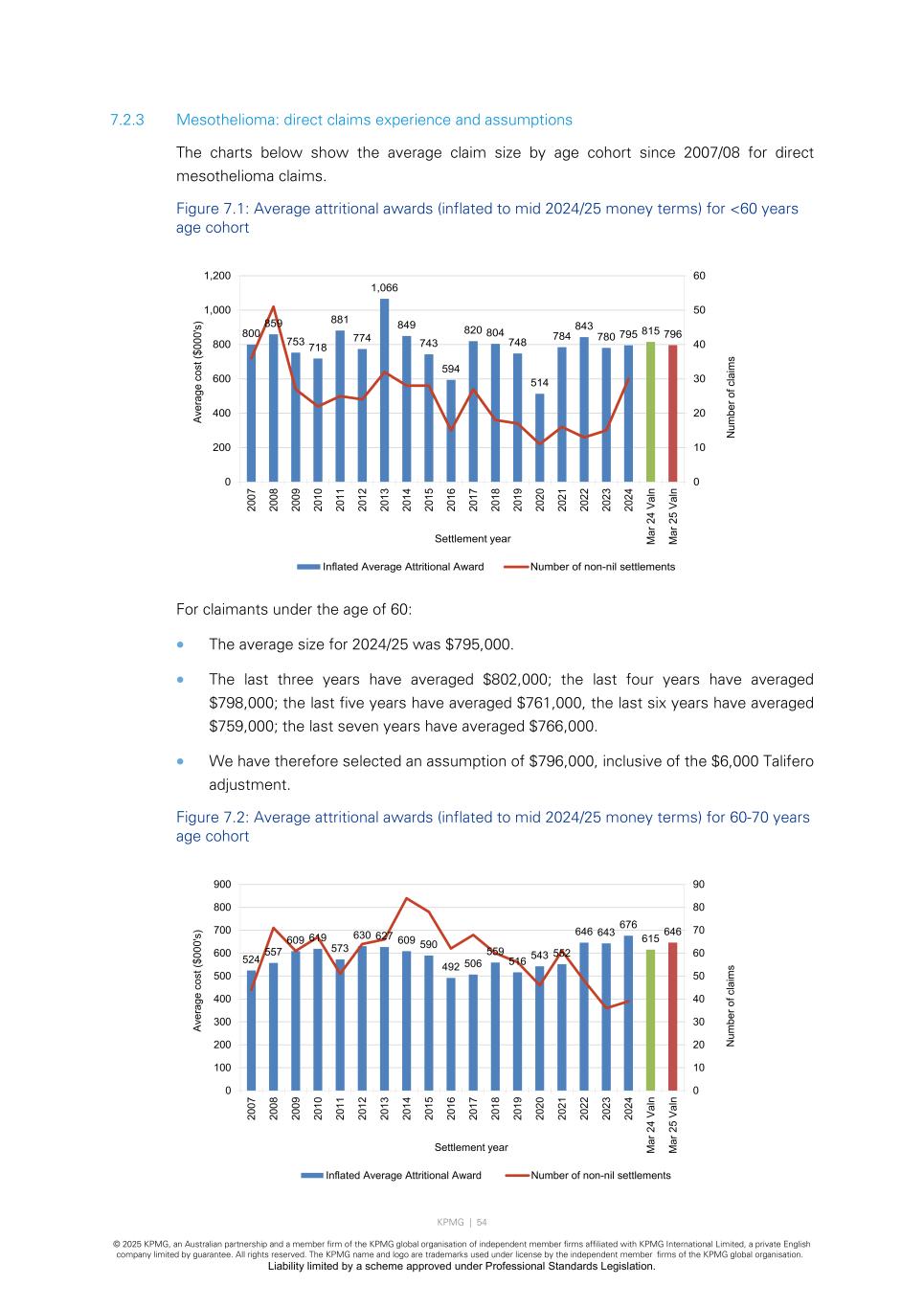 KPMG | 54 © 2025 KPMG, an Australian partnership and a member firm of the KPMG global organisation of independent member firms affiliated with KPMG International Limited, a private English company limited by guarantee. All rights reserved. The KPMG name and logo are trademarks used under license by the independent member firms of the KPMG global organisation. Liability limited by a scheme approved under Professional Standards Legislation. 7.2.3 Mesothelioma: direct claims experience and assumptions The charts below show the average claim size by age cohort since 2007/08 for direct mesothelioma claims. Figure 7.1: Average attritional awards (inflated to mid 2024/25 money terms) for <60 years age cohort For claimants under the age of 60: • The average size for 2024/25 was $795,000. • The last three years have averaged $802,000; the last four years have averaged $798,000; the last five years have averaged $761,000, the last six years have averaged $759,000; the last seven years have averaged $766,000. • We have therefore selected an assumption of $796,000, inclusive of the $6,000 Talifero adjustment. Figure 7.2: Average attritional awards (inflated to mid 2024/25 money terms) for 60-70 years age cohort 800 859 753 718 881 774 1,066 849 743 594 820 804 748 514 784 843 780 795 815 796 0 10 20 30 40 50 60 0 200 400 600 800 1,000 1,200 20 07 20 08 20 09 20 10 20 11 20 12 20 13 20 14 20 15 20 16 20 17 20 18 20 19 20 20 20 21 20 22 20 23 20 24 M ar 2 4 Va ln M ar 2 5 Va ln N um be r o f c la im s Av er ag e co st ($ 00 0' s) Settlement year Inflated Average Attritional Award Number of non-nil settlements 524 557 609 619 573 630 627 609 590 492 506 559 516 543 552 646 643 676 615 646 0 10 20 30 40 50 60 70 80 90 0 100 200 300 400 500 600 700 800 900 20 07 20 08 20 09 20 10 20 11 20 12 20 13 20 14 20 15 20 16 20 17 20 18 20 19 20 20 20 21 20 22 20 23 20 24 M ar 2 4 Va ln M ar 2 5 Va ln N um be r o f c la im s Av er ag e co st ($ 00 0' s) Settlement year Inflated Average Attritional Award Number of non-nil settlements