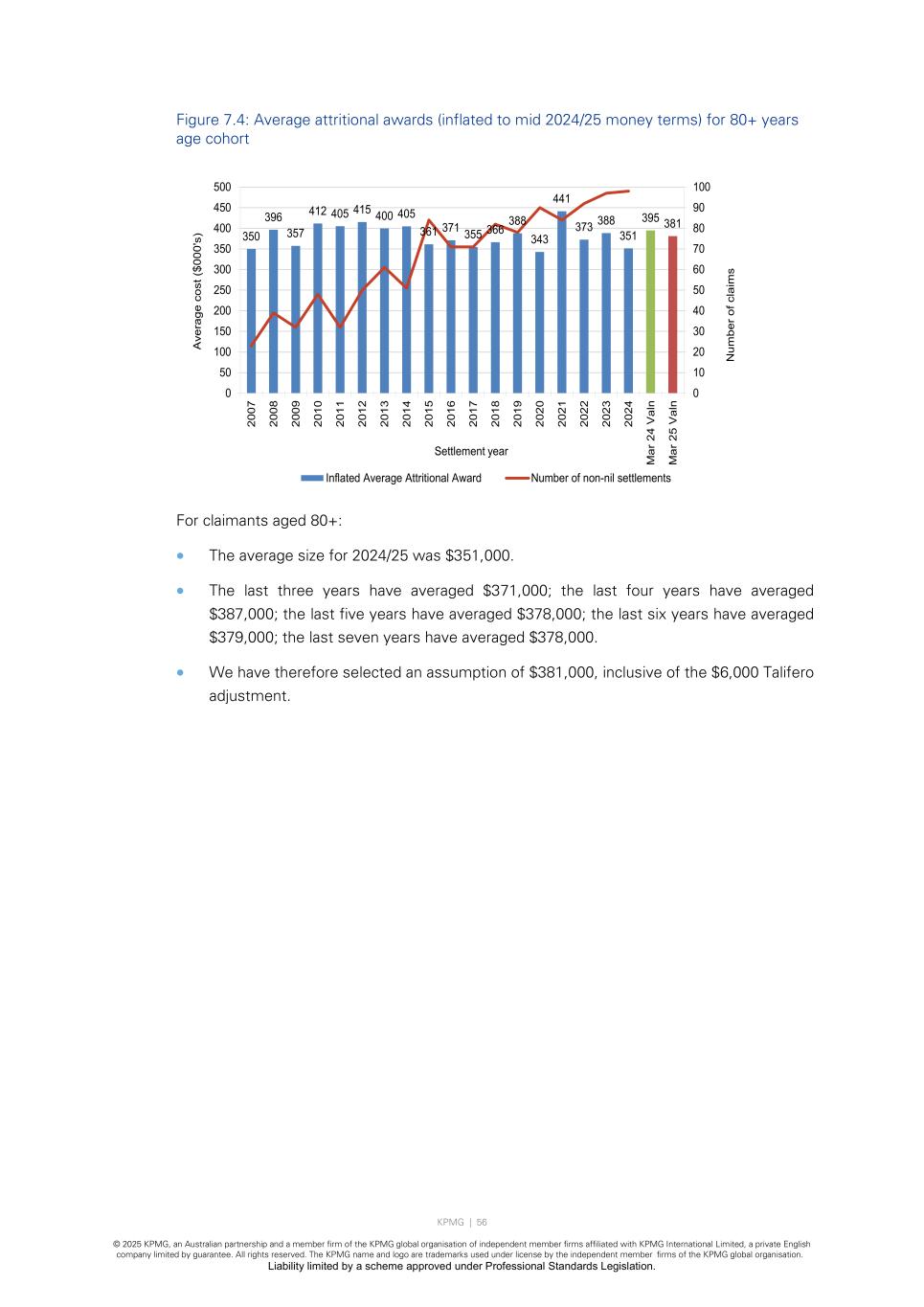 KPMG | 56 © 2025 KPMG, an Australian partnership and a member firm of the KPMG global organisation of independent member firms affiliated with KPMG International Limited, a private English company limited by guarantee. All rights reserved. The KPMG name and logo are trademarks used under license by the independent member firms of the KPMG global organisation. Liability limited by a scheme approved under Professional Standards Legislation. Figure 7.4: Average attritional awards (inflated to mid 2024/25 money terms) for 80+ years age cohort For claimants aged 80+: • The average size for 2024/25 was $351,000. • The last three years have averaged $371,000; the last four years have averaged $387,000; the last five years have averaged $378,000; the last six years have averaged $379,000; the last seven years have averaged $378,000. • We have therefore selected an assumption of $381,000, inclusive of the $6,000 Talifero adjustment. 350 396 357 412 405 415 400 405 361 371 355 366 388 343 441 373 388 351 395 381 0 10 20 30 40 50 60 70 80 90 100 0 50 100 150 200 250 300 350 400 450 500 20 07 20 08 20 09 20 10 20 11 20 12 20 13 20 14 20 15 20 16 20 17 20 18 20 19 20 20 20 21 20 22 20 23 20 24 M ar 2 4 V al n M ar 2 5 V al n N um be r of c la im s A ve ra ge c os t ( $0 00 's ) Settlement year Inflated Average Attritional Award Number of non-nil settlements