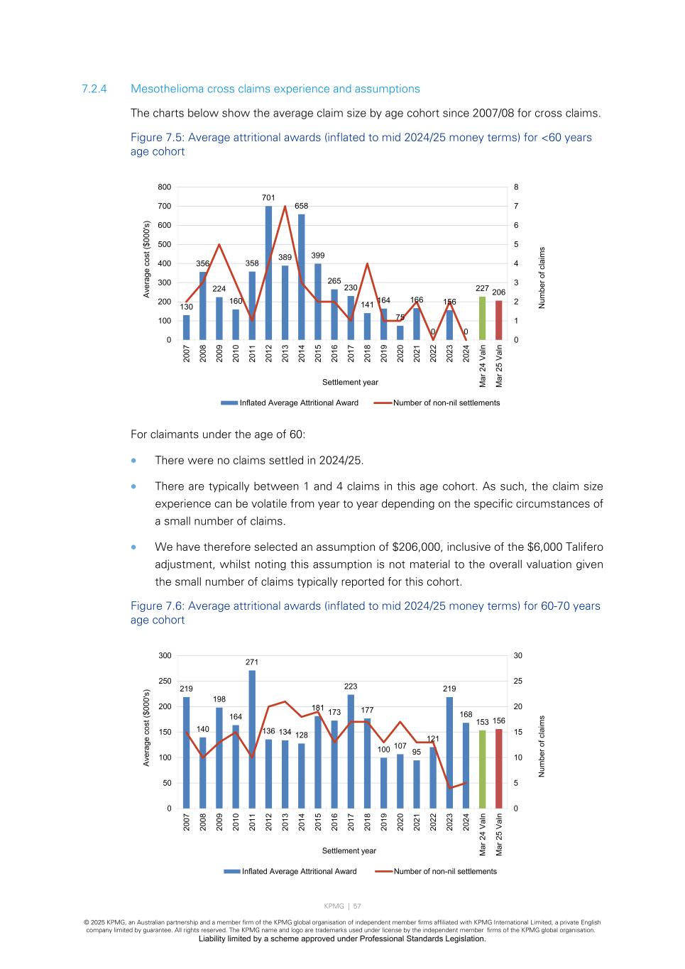 KPMG | 57 © 2025 KPMG, an Australian partnership and a member firm of the KPMG global organisation of independent member firms affiliated with KPMG International Limited, a private English company limited by guarantee. All rights reserved. The KPMG name and logo are trademarks used under license by the independent member firms of the KPMG global organisation. Liability limited by a scheme approved under Professional Standards Legislation. 7.2.4 Mesothelioma cross claims experience and assumptions The charts below show the average claim size by age cohort since 2007/08 for cross claims. Figure 7.5: Average attritional awards (inflated to mid 2024/25 money terms) for <60 years age cohort For claimants under the age of 60: • There were no claims settled in 2024/25. • There are typically between 1 and 4 claims in this age cohort. As such, the claim size experience can be volatile from year to year depending on the specific circumstances of a small number of claims. • We have therefore selected an assumption of $206,000, inclusive of the $6,000 Talifero adjustment, whilst noting this assumption is not material to the overall valuation given the small number of claims typically reported for this cohort. Figure 7.6: Average attritional awards (inflated to mid 2024/25 money terms) for 60-70 years age cohort 130 356 224 160 358 701 389 658 399 265 230 141 164 75 166 0 156 0 227 206 0 1 2 3 4 5 6 7 8 0 100 200 300 400 500 600 700 800 20 07 20 08 20 09 20 10 20 11 20 12 20 13 20 14 20 15 20 16 20 17 20 18 20 19 20 20 20 21 20 22 20 23 20 24 M ar 2 4 Va ln M ar 2 5 Va ln N um be r o f c la im s Av er ag e co st ($ 00 0' s) Settlement year Inflated Average Attritional Award Number of non-nil settlements 219 140 198 164 271 136 134 128 181 173 223 177 100 107 95 121 219 168 153 156 0 5 10 15 20 25 30 0 50 100 150 200 250 300 20 07 20 08 20 09 20 10 20 11 20 12 20 13 20 14 20 15 20 16 20 17 20 18 20 19 20 20 20 21 20 22 20 23 20 24 M ar 2 4 V al n M ar 2 5 V al n N um be r o f c la im s A ve ra ge c os t ( $0 00 's ) Settlement year Inflated Average Attritional Award Number of non-nil settlements