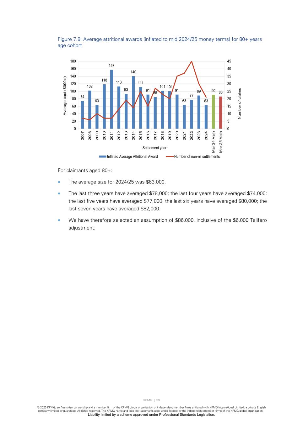 KPMG | 59 © 2025 KPMG, an Australian partnership and a member firm of the KPMG global organisation of independent member firms affiliated with KPMG International Limited, a private English company limited by guarantee. All rights reserved. The KPMG name and logo are trademarks used under license by the independent member firms of the KPMG global organisation. Liability limited by a scheme approved under Professional Standards Legislation. Figure 7.8: Average attritional awards (inflated to mid 2024/25 money terms) for 80+ years age cohort For claimants aged 80+: • The average size for 2024/25 was $63,000. • The last three years have averaged $78,000; the last four years have averaged $74,000; the last five years have averaged $77,000; the last six years have averaged $80,000; the last seven years have averaged $82,000. • We have therefore selected an assumption of $86,000, inclusive of the $6,000 Talifero adjustment. 74 102 63 118 157 113 93 140 111 91 85 101 101 91 63 77 89 63 90 86 0 5 10 15 20 25 30 35 40 45 0 20 40 60 80 100 120 140 160 180 20 07 20 08 20 09 20 10 20 11 20 12 20 13 20 14 20 15 20 16 20 17 20 18 20 19 20 20 20 21 20 22 20 23 20 24 M ar 2 4 V al n M ar 2 5 V al n N um be r of c la im s A ve ra ge c os t ( $0 00 's ) Settlement year Inflated Average Attritional Award Number of non-nil settlements