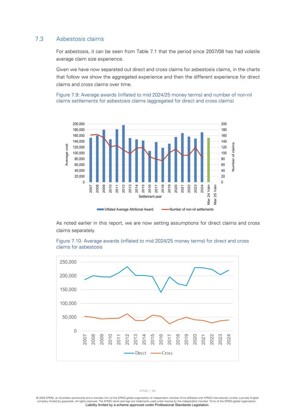 KPMG | 60 © 2025 KPMG, an Australian partnership and a member firm of the KPMG global organisation of independent member firms affiliated with KPMG International Limited, a private English company limited by guarantee. All rights reserved. The KPMG name and logo are trademarks used under license by the independent member firms of the KPMG global organisation. Liability limited by a scheme approved under Professional Standards Legislation. 7.3 Asbestosis claims For asbestosis, it can be seen from Table 7.1 that the period since 2007/08 has had volatile average claim size experience. Given we have now separated out direct and cross claims for asbestosis claims, in the charts that follow we show the aggregated experience and then the different experience for direct claims and cross claims over time. Figure 7.9: Average awards (inflated to mid 2024/25 money terms) and number of non-nil claims settlements for asbestosis claims (aggregated for direct and cross claims) As noted earlier in this report, we are now setting assumptions for direct claims and cross claims separately. Figure 7.10: Average awards (inflated to mid 2024/25 money terms) for direct and cross claims for asbestosis 0 20 40 60 80 100 120 140 160 180 200 0 20,000 40,000 60,000 80,000 100,000 120,000 140,000 160,000 180,000 200,000 20 07 20 08 20 09 20 10 20 11 20 12 20 13 20 14 20 15 20 16 20 17 20 18 20 19 20 20 20 21 20 22 20 23 20 24 M ar 2 4 V al n M ar 2 5 V al n N um be r of c la im s A ve ra ge c os t Settlement year Inflated Average Attritional Award Number of non-nil settlements 0 50,000 100,000 150,000 200,000 250,000 20 07 20 08 20 09 20 10 20 11 20 12 20 13 20 14 20 15 20 16 20 17 20 18 20 19 20 20 20 21 20 22 20 23 20 24 Direct Cross