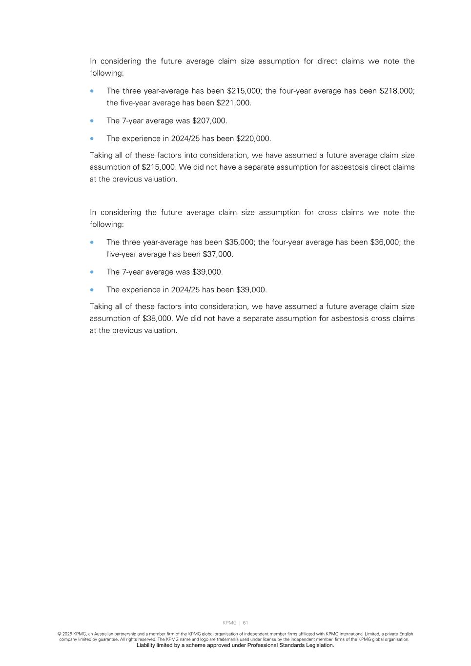 KPMG | 61 © 2025 KPMG, an Australian partnership and a member firm of the KPMG global organisation of independent member firms affiliated with KPMG International Limited, a private English company limited by guarantee. All rights reserved. The KPMG name and logo are trademarks used under license by the independent member firms of the KPMG global organisation. Liability limited by a scheme approved under Professional Standards Legislation. In considering the future average claim size assumption for direct claims we note the following: • The three year-average has been $215,000; the four-year average has been $218,000; the five-year average has been $221,000. • The 7-year average was $207,000. • The experience in 2024/25 has been $220,000. Taking all of these factors into consideration, we have assumed a future average claim size assumption of $215,000. We did not have a separate assumption for asbestosis direct claims at the previous valuation. In considering the future average claim size assumption for cross claims we note the following: • The three year-average has been $35,000; the four-year average has been $36,000; the five-year average has been $37,000. • The 7-year average was $39,000. • The experience in 2024/25 has been $39,000. Taking all of these factors into consideration, we have assumed a future average claim size assumption of $38,000. We did not have a separate assumption for asbestosis cross claims at the previous valuation.