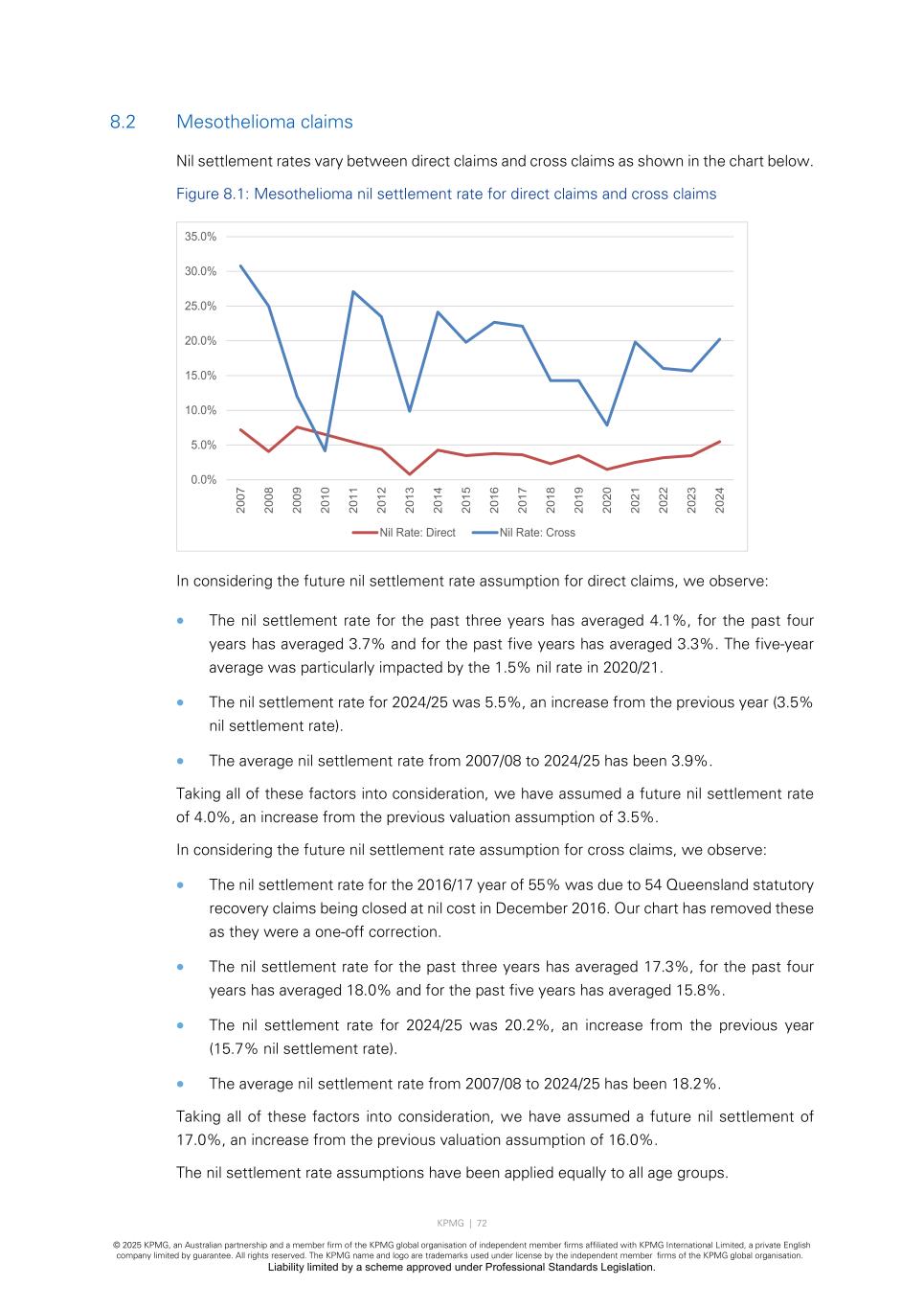 KPMG | 72 © 2025 KPMG, an Australian partnership and a member firm of the KPMG global organisation of independent member firms affiliated with KPMG International Limited, a private English company limited by guarantee. All rights reserved. The KPMG name and logo are trademarks used under license by the independent member firms of the KPMG global organisation. Liability limited by a scheme approved under Professional Standards Legislation. 8.2 Mesothelioma claims Nil settlement rates vary between direct claims and cross claims as shown in the chart below. Figure 8.1: Mesothelioma nil settlement rate for direct claims and cross claims In considering the future nil settlement rate assumption for direct claims, we observe: • The nil settlement rate for the past three years has averaged 4.1%, for the past four years has averaged 3.7% and for the past five years has averaged 3.3%. The five-year average was particularly impacted by the 1.5% nil rate in 2020/21. • The nil settlement rate for 2024/25 was 5.5%, an increase from the previous year (3.5% nil settlement rate). • The average nil settlement rate from 2007/08 to 2024/25 has been 3.9%. Taking all of these factors into consideration, we have assumed a future nil settlement rate of 4.0%, an increase from the previous valuation assumption of 3.5%. In considering the future nil settlement rate assumption for cross claims, we observe: • The nil settlement rate for the 2016/17 year of 55% was due to 54 Queensland statutory recovery claims being closed at nil cost in December 2016. Our chart has removed these as they were a one-off correction. • The nil settlement rate for the past three years has averaged 17.3%, for the past four years has averaged 18.0% and for the past five years has averaged 15.8%. • The nil settlement rate for 2024/25 was 20.2%, an increase from the previous year (15.7% nil settlement rate). • The average nil settlement rate from 2007/08 to 2024/25 has been 18.2%. Taking all of these factors into consideration, we have assumed a future nil settlement of 17.0%, an increase from the previous valuation assumption of 16.0%. The nil settlement rate assumptions have been applied equally to all age groups. 0.0% 5.0% 10.0% 15.0% 20.0% 25.0% 30.0% 35.0% 20 07 20 08 20 09 20 10 20 11 20 12 20 13 20 14 20 15 20 16 20 17 20 18 20 19 20 20 20 21 20 22 20 23 20 24 Nil Rate: Direct Nil Rate: Cross