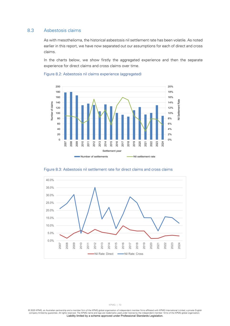 KPMG | 73 © 2025 KPMG, an Australian partnership and a member firm of the KPMG global organisation of independent member firms affiliated with KPMG International Limited, a private English company limited by guarantee. All rights reserved. The KPMG name and logo are trademarks used under license by the independent member firms of the KPMG global organisation. Liability limited by a scheme approved under Professional Standards Legislation. 8.3 Asbestosis claims As with mesothelioma, the historical asbestosis nil settlement rate has been volatile. As noted earlier in this report, we have now separated out our assumptions for each of direct and cross claims. In the charts below, we show firstly the aggregated experience and then the separate experience for direct claims and cross claims over time. Figure 8.2: Asbestosis nil claims experience (aggregated) Figure 8.3: Asbestosis nil settlement rate for direct claims and cross claims 0% 2% 4% 6% 8% 10% 12% 14% 16% 18% 20% 0 20 40 60 80 100 120 140 160 180 200 20 07 20 08 20 09 20 10 20 11 20 12 20 13 20 14 20 15 20 16 20 17 20 18 20 19 20 20 20 21 20 22 20 23 20 24 Ni l S et tle m en t R at e Nu m be r o f c la im s Settlement year Number of settlements Nil settlement rate 0.0% 5.0% 10.0% 15.0% 20.0% 25.0% 30.0% 35.0% 40.0% 20 07 20 08 20 09 20 10 20 11 20 12 20 13 20 14 20 15 20 16 20 17 20 18 20 19 20 20 20 21 20 22 20 23 20 24 Nil Rate: Direct Nil Rate: Cross