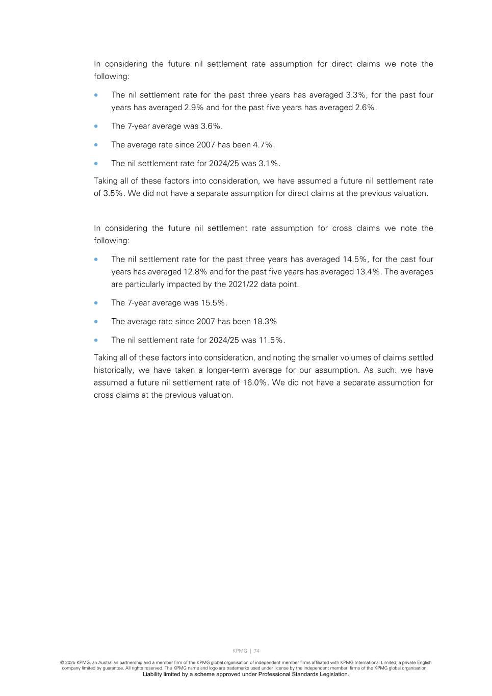 KPMG | 74 © 2025 KPMG, an Australian partnership and a member firm of the KPMG global organisation of independent member firms affiliated with KPMG International Limited, a private English company limited by guarantee. All rights reserved. The KPMG name and logo are trademarks used under license by the independent member firms of the KPMG global organisation. Liability limited by a scheme approved under Professional Standards Legislation. In considering the future nil settlement rate assumption for direct claims we note the following: • The nil settlement rate for the past three years has averaged 3.3%, for the past four years has averaged 2.9% and for the past five years has averaged 2.6%. • The 7-year average was 3.6%. • The average rate since 2007 has been 4.7%. • The nil settlement rate for 2024/25 was 3.1%. Taking all of these factors into consideration, we have assumed a future nil settlement rate of 3.5%. We did not have a separate assumption for direct claims at the previous valuation. In considering the future nil settlement rate assumption for cross claims we note the following: • The nil settlement rate for the past three years has averaged 14.5%, for the past four years has averaged 12.8% and for the past five years has averaged 13.4%. The averages are particularly impacted by the 2021/22 data point. • The 7-year average was 15.5%. • The average rate since 2007 has been 18.3% • The nil settlement rate for 2024/25 was 11.5%. Taking all of these factors into consideration, and noting the smaller volumes of claims settled historically, we have taken a longer-term average for our assumption. As such. we have assumed a future nil settlement rate of 16.0%. We did not have a separate assumption for cross claims at the previous valuation.