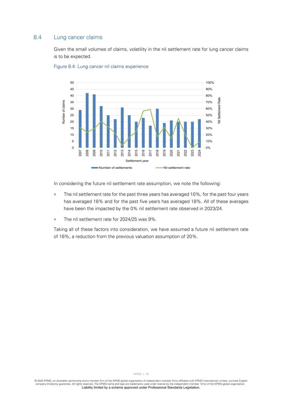 KPMG | 75 © 2025 KPMG, an Australian partnership and a member firm of the KPMG global organisation of independent member firms affiliated with KPMG International Limited, a private English company limited by guarantee. All rights reserved. The KPMG name and logo are trademarks used under license by the independent member firms of the KPMG global organisation. Liability limited by a scheme approved under Professional Standards Legislation. 8.4 Lung cancer claims Given the small volumes of claims, volatility in the nil settlement rate for lung cancer claims is to be expected. Figure 8.4: Lung cancer nil claims experience In considering the future nil settlement rate assumption, we note the following: • The nil settlement rate for the past three years has averaged 10%, for the past four years has averaged 18% and for the past five years has averaged 18%. All of these averages have been the impacted by the 0% nil settlement rate observed in 2023/24. • The nil settlement rate for 2024/25 was 9%. Taking all of these factors into consideration, we have assumed a future nil settlement rate of 18%, a reduction from the previous valuation assumption of 20%. 0% 10% 20% 30% 40% 50% 60% 70% 80% 90% 100% 0 5 10 15 20 25 30 35 40 45 50 20 07 20 08 20 09 20 10 20 11 20 12 20 13 20 14 20 15 20 16 20 17 20 18 20 19 20 20 20 21 20 22 20 23 20 24 Ni l S et tle m en t R at e Nu m be r o f c la im s Settlement year Number of settlements Nil settlement rate