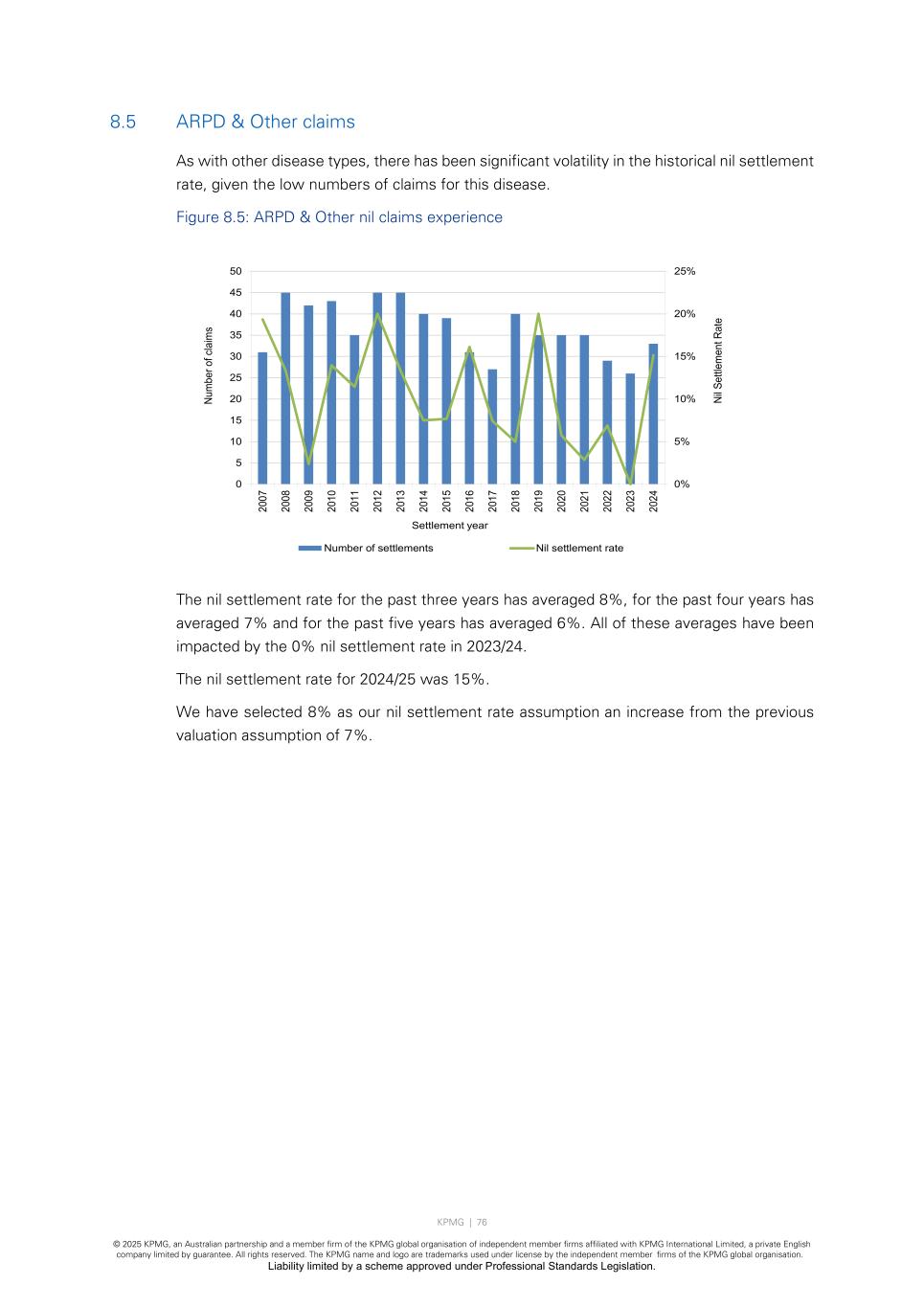 KPMG | 76 © 2025 KPMG, an Australian partnership and a member firm of the KPMG global organisation of independent member firms affiliated with KPMG International Limited, a private English company limited by guarantee. All rights reserved. The KPMG name and logo are trademarks used under license by the independent member firms of the KPMG global organisation. Liability limited by a scheme approved under Professional Standards Legislation. 8.5 ARPD & Other claims As with other disease types, there has been significant volatility in the historical nil settlement rate, given the low numbers of claims for this disease. Figure 8.5: ARPD & Other nil claims experience The nil settlement rate for the past three years has averaged 8%, for the past four years has averaged 7% and for the past five years has averaged 6%. All of these averages have been impacted by the 0% nil settlement rate in 2023/24. The nil settlement rate for 2024/25 was 15%. We have selected 8% as our nil settlement rate assumption an increase from the previous valuation assumption of 7%. 0% 5% 10% 15% 20% 25% 0 5 10 15 20 25 30 35 40 45 50 20 07 20 08 20 09 20 10 20 11 20 12 20 13 20 14 20 15 20 16 20 17 20 18 20 19 20 20 20 21 20 22 20 23 20 24 Ni l S et tle m en t R at e Nu m be r o f c la im s Settlement year Number of settlements Nil settlement rate