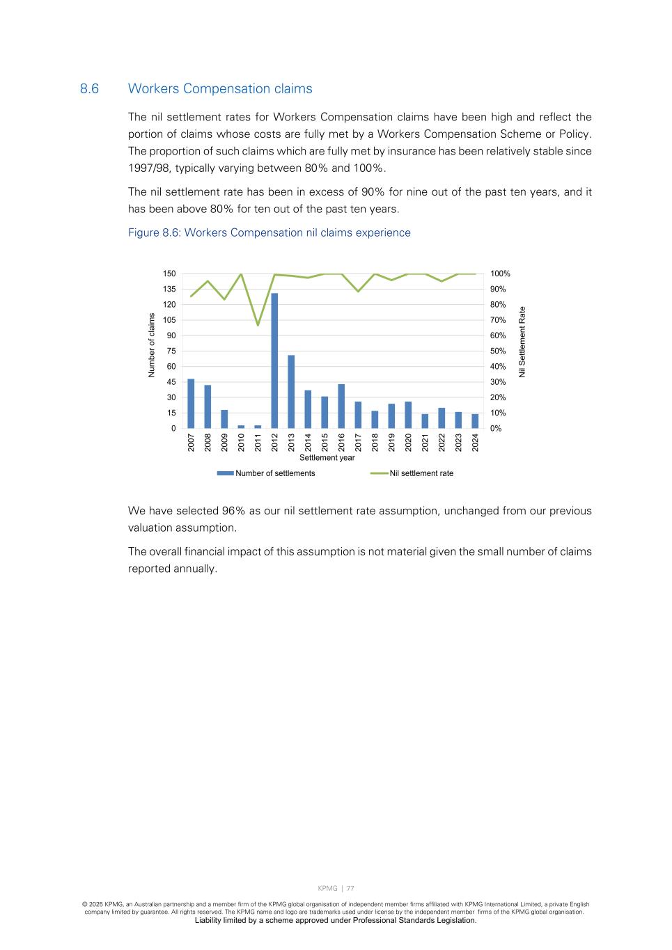 KPMG | 77 © 2025 KPMG, an Australian partnership and a member firm of the KPMG global organisation of independent member firms affiliated with KPMG International Limited, a private English company limited by guarantee. All rights reserved. The KPMG name and logo are trademarks used under license by the independent member firms of the KPMG global organisation. Liability limited by a scheme approved under Professional Standards Legislation. 8.6 Workers Compensation claims The nil settlement rates for Workers Compensation claims have been high and reflect the portion of claims whose costs are fully met by a Workers Compensation Scheme or Policy. The proportion of such claims which are fully met by insurance has been relatively stable since 1997/98, typically varying between 80% and 100%. The nil settlement rate has been in excess of 90% for nine out of the past ten years, and it has been above 80% for ten out of the past ten years. Figure 8.6: Workers Compensation nil claims experience We have selected 96% as our nil settlement rate assumption, unchanged from our previous valuation assumption. The overall financial impact of this assumption is not material given the small number of claims reported annually. 0% 10% 20% 30% 40% 50% 60% 70% 80% 90% 100% 0 15 30 45 60 75 90 105 120 135 150 20 07 20 08 20 09 20 10 20 11 20 12 20 13 20 14 20 15 20 16 20 17 20 18 20 19 20 20 20 21 20 22 20 23 20 24 N il S et tle m en t R at e N um be r o f c la im s Settlement year Number of settlements Nil settlement rate