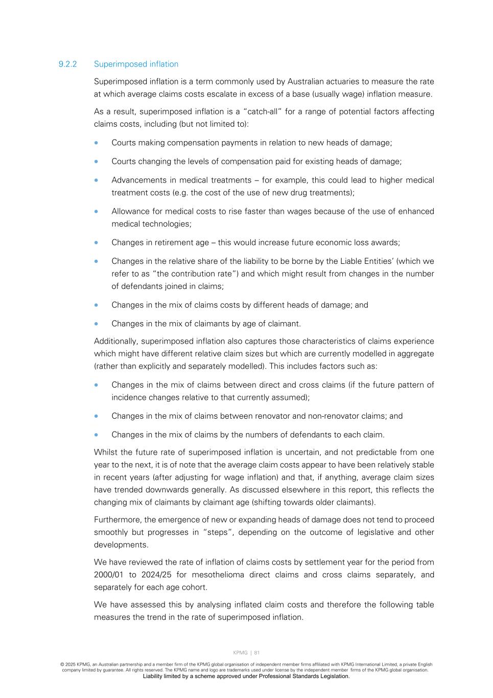 KPMG | 81 © 2025 KPMG, an Australian partnership and a member firm of the KPMG global organisation of independent member firms affiliated with KPMG International Limited, a private English company limited by guarantee. All rights reserved. The KPMG name and logo are trademarks used under license by the independent member firms of the KPMG global organisation. Liability limited by a scheme approved under Professional Standards Legislation. 9.2.2 Superimposed inflation Superimposed inflation is a term commonly used by Australian actuaries to measure the rate at which average claims costs escalate in excess of a base (usually wage) inflation measure. As a result, superimposed inflation is a “catch-all” for a range of potential factors affecting claims costs, including (but not limited to): • Courts making compensation payments in relation to new heads of damage; • Courts changing the levels of compensation paid for existing heads of damage; • Advancements in medical treatments – for example, this could lead to higher medical treatment costs (e.g. the cost of the use of new drug treatments); • Allowance for medical costs to rise faster than wages because of the use of enhanced medical technologies; • Changes in retirement age – this would increase future economic loss awards; • Changes in the relative share of the liability to be borne by the Liable Entities’ (which we refer to as “the contribution rate”) and which might result from changes in the number of defendants joined in claims; • Changes in the mix of claims costs by different heads of damage; and • Changes in the mix of claimants by age of claimant. Additionally, superimposed inflation also captures those characteristics of claims experience which might have different relative claim sizes but which are currently modelled in aggregate (rather than explicitly and separately modelled). This includes factors such as: • Changes in the mix of claims between direct and cross claims (if the future pattern of incidence changes relative to that currently assumed); • Changes in the mix of claims between renovator and non-renovator claims; and • Changes in the mix of claims by the numbers of defendants to each claim. Whilst the future rate of superimposed inflation is uncertain, and not predictable from one year to the next, it is of note that the average claim costs appear to have been relatively stable in recent years (after adjusting for wage inflation) and that, if anything, average claim sizes have trended downwards generally. As discussed elsewhere in this report, this reflects the changing mix of claimants by claimant age (shifting towards older claimants). Furthermore, the emergence of new or expanding heads of damage does not tend to proceed smoothly but progresses in “steps”, depending on the outcome of legislative and other developments. We have reviewed the rate of inflation of claims costs by settlement year for the period from 2000/01 to 2024/25 for mesothelioma direct claims and cross claims separately, and separately for each age cohort. We have assessed this by analysing inflated claim costs and therefore the following table measures the trend in the rate of superimposed inflation.
