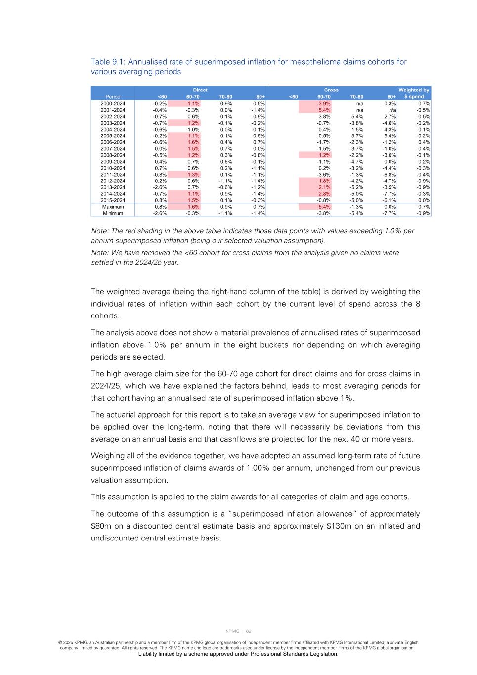 KPMG | 82 © 2025 KPMG, an Australian partnership and a member firm of the KPMG global organisation of independent member firms affiliated with KPMG International Limited, a private English company limited by guarantee. All rights reserved. The KPMG name and logo are trademarks used under license by the independent member firms of the KPMG global organisation. Liability limited by a scheme approved under Professional Standards Legislation. Table 9.1: Annualised rate of superimposed inflation for mesothelioma claims cohorts for various averaging periods Note: The red shading in the above table indicates those data points with values exceeding 1.0% per annum superimposed inflation (being our selected valuation assumption). Note: We have removed the <60 cohort for cross claims from the analysis given no claims were settled in the 2024/25 year. The weighted average (being the right-hand column of the table) is derived by weighting the individual rates of inflation within each cohort by the current level of spend across the 8 cohorts. The analysis above does not show a material prevalence of annualised rates of superimposed inflation above 1.0% per annum in the eight buckets nor depending on which averaging periods are selected. The high average claim size for the 60-70 age cohort for direct claims and for cross claims in 2024/25, which we have explained the factors behind, leads to most averaging periods for that cohort having an annualised rate of superimposed inflation above 1%. The actuarial approach for this report is to take an average view for superimposed inflation to be applied over the long-term, noting that there will necessarily be deviations from this average on an annual basis and that cashflows are projected for the next 40 or more years. Weighing all of the evidence together, we have adopted an assumed long-term rate of future superimposed inflation of claims awards of 1.00% per annum, unchanged from our previous valuation assumption. This assumption is applied to the claim awards for all categories of claim and age cohorts. The outcome of this assumption is a “superimposed inflation allowance” of approximately $80m on a discounted central estimate basis and approximately $130m on an inflated and undiscounted central estimate basis. Period <60 60-70 70-80 80+ <60 60-70 70-80 80+ 2000-2024 -0.2% 1.1% 0.9% 0.5% 3.9% n/a -0.3% 0.7% 2001-2024 -0.4% -0.3% 0.0% -1.4% 5.4% n/a n/a -0.5% 2002-2024 -0.7% 0.6% 0.1% -0.9% -3.8% -5.4% -2.7% -0.5% 2003-2024 -0.7% 1.2% -0.1% -0.2% -0.7% -3.8% -4.6% -0.2% 2004-2024 -0.6% 1.0% 0.0% -0.1% 0.4% -1.5% -4.3% -0.1% 2005-2024 -0.2% 1.1% 0.1% -0.5% 0.5% -3.7% -5.4% -0.2% 2006-2024 -0.6% 1.6% 0.4% 0.7% -1.7% -2.3% -1.2% 0.4% 2007-2024 0.0% 1.5% 0.7% 0.0% -1.5% -3.7% -1.0% 0.4% 2008-2024 -0.5% 1.2% 0.3% -0.8% 1.2% -2.2% -3.0% -0.1% 2009-2024 0.4% 0.7% 0.6% -0.1% -1.1% -4.7% 0.0% 0.2% 2010-2024 0.7% 0.6% 0.2% -1.1% 0.2% -3.2% -4.4% -0.3% 2011-2024 -0.8% 1.3% 0.1% -1.1% -3.6% -1.3% -6.8% -0.4% 2012-2024 0.2% 0.6% -1.1% -1.4% 1.8% -4.2% -4.7% -0.9% 2013-2024 -2.6% 0.7% -0.6% -1.2% 2.1% -5.2% -3.5% -0.9% 2014-2024 -0.7% 1.1% 0.9% -1.4% 2.8% -5.0% -7.7% -0.3% 2015-2024 0.8% 1.5% 0.1% -0.3% -0.8% -5.0% -6.1% 0.0% Maximum 0.8% 1.6% 0.9% 0.7% 5.4% -1.3% 0.0% 0.7% Minimum -2.6% -0.3% -1.1% -1.4% -3.8% -5.4% -7.7% -0.9% CrossDirect Weighted by $ spend