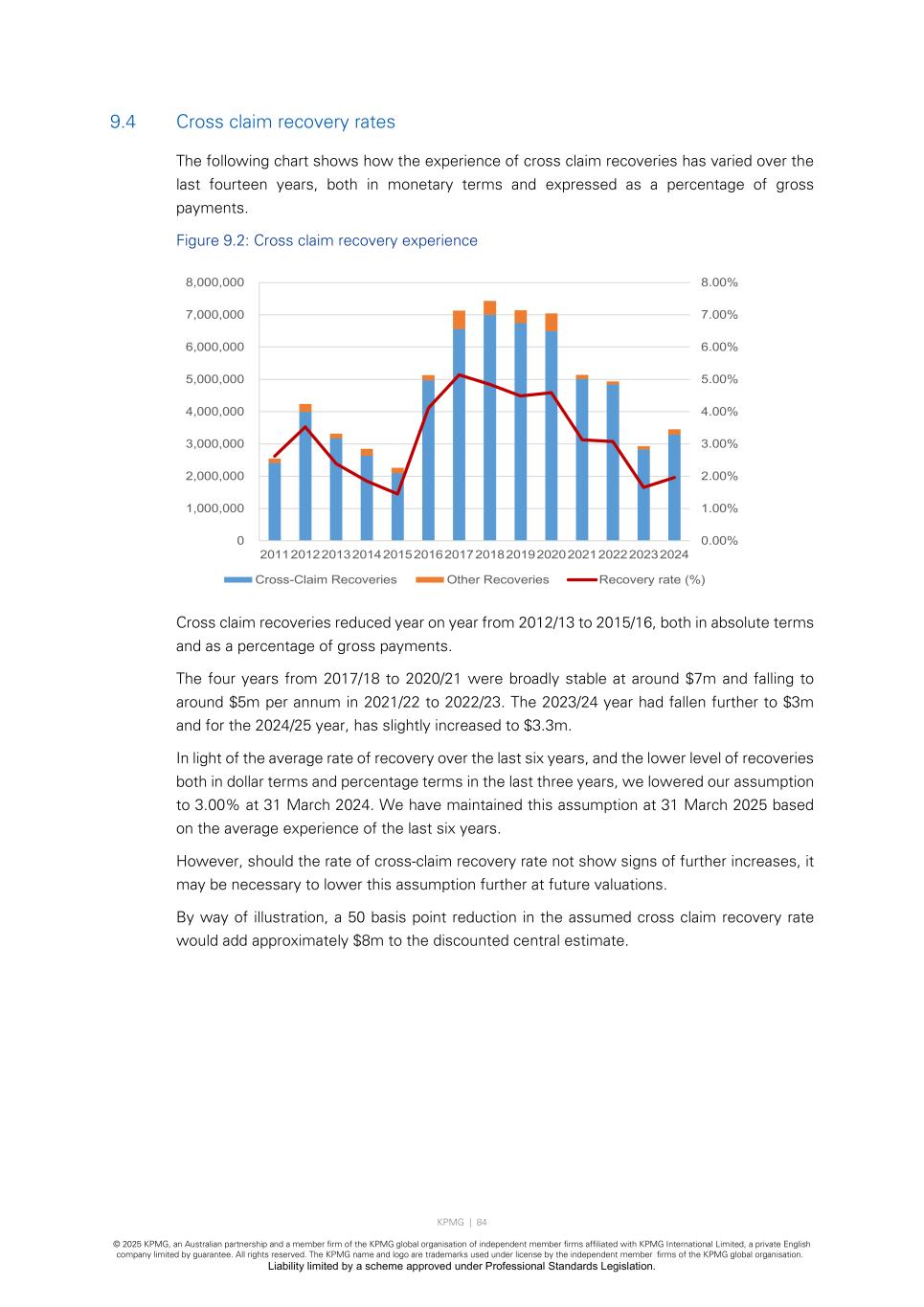 KPMG | 84 © 2025 KPMG, an Australian partnership and a member firm of the KPMG global organisation of independent member firms affiliated with KPMG International Limited, a private English company limited by guarantee. All rights reserved. The KPMG name and logo are trademarks used under license by the independent member firms of the KPMG global organisation. Liability limited by a scheme approved under Professional Standards Legislation. 9.4 Cross claim recovery rates The following chart shows how the experience of cross claim recoveries has varied over the last fourteen years, both in monetary terms and expressed as a percentage of gross payments. Figure 9.2: Cross claim recovery experience Cross claim recoveries reduced year on year from 2012/13 to 2015/16, both in absolute terms and as a percentage of gross payments. The four years from 2017/18 to 2020/21 were broadly stable at around $7m and falling to around $5m per annum in 2021/22 to 2022/23. The 2023/24 year had fallen further to $3m and for the 2024/25 year, has slightly increased to $3.3m. In light of the average rate of recovery over the last six years, and the lower level of recoveries both in dollar terms and percentage terms in the last three years, we lowered our assumption to 3.00% at 31 March 2024. We have maintained this assumption at 31 March 2025 based on the average experience of the last six years. However, should the rate of cross-claim recovery rate not show signs of further increases, it may be necessary to lower this assumption further at future valuations. By way of illustration, a 50 basis point reduction in the assumed cross claim recovery rate would add approximately $8m to the discounted central estimate. 0.00% 1.00% 2.00% 3.00% 4.00% 5.00% 6.00% 7.00% 8.00% 0 1,000,000 2,000,000 3,000,000 4,000,000 5,000,000 6,000,000 7,000,000 8,000,000 20112012201320142015201620172018201920202021202220232024 Cross-Claim Recoveries Other Recoveries Recovery rate (%)