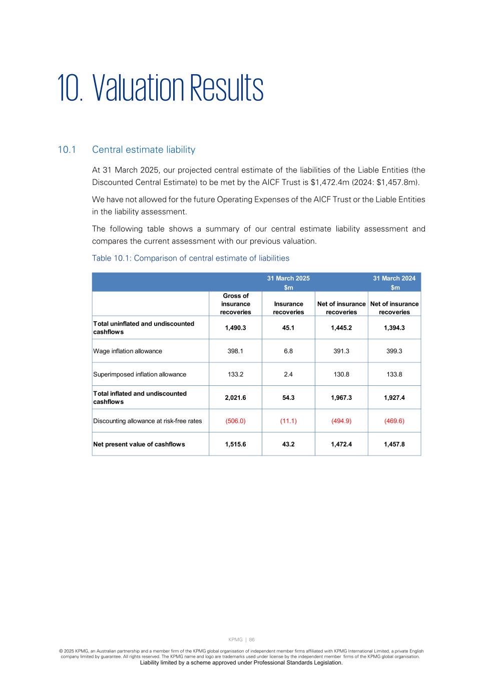 KPMG | 86 © 2025 KPMG, an Australian partnership and a member firm of the KPMG global organisation of independent member firms affiliated with KPMG International Limited, a private English company limited by guarantee. All rights reserved. The KPMG name and logo are trademarks used under license by the independent member firms of the KPMG global organisation. Liability limited by a scheme approved under Professional Standards Legislation. 10. Valuation Results 10.1 Central estimate liability At 31 March 2025, our projected central estimate of the liabilities of the Liable Entities (the Discounted Central Estimate) to be met by the AICF Trust is $1,472.4m (2024: $1,457.8m). We have not allowed for the future Operating Expenses of the AICF Trust or the Liable Entities in the liability assessment. The following table shows a summary of our central estimate liability assessment and compares the current assessment with our previous valuation. Table 10.1: Comparison of central estimate of liabilities 31 March 2024 $m Gross of insurance recoveries Insurance recoveries Net of insurance recoveries Net of insurance recoveries Total uninflated and undiscounted cashflows 1,490.3 45.1 1,445.2 1,394.3 Wage inflation allowance 398.1 6.8 391.3 399.3 Superimposed inflation allowance 133.2 2.4 130.8 133.8 Total inflated and undiscounted cashflows 2,021.6 54.3 1,967.3 1,927.4 Discounting allowance at risk-free rates (506.0) (11.1) (494.9) (469.6) Net present value of cashflows 1,515.6 43.2 1,472.4 1,457.8 31 March 2025 $m