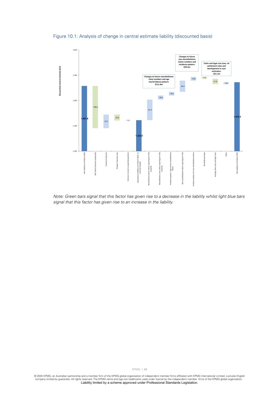 KPMG | 88 © 2025 KPMG, an Australian partnership and a member firm of the KPMG global organisation of independent member firms affiliated with KPMG International Limited, a private English company limited by guarantee. All rights reserved. The KPMG name and logo are trademarks used under license by the independent member firms of the KPMG global organisation. Liability limited by a scheme approved under Professional Standards Legislation. Figure 10.1: Analysis of change in central estimate liability (discounted basis) Note: Green bars signal that this factor has given rise to a decrease in the liability whilst light blue bars signal that this factor has given rise to an increase in the liability. 1,457.8 1,322.5 1,472.4 166.9 53.7 23.6 1.5 81.4 16.0 14.4 44.4 14.8 7.0 21.8 7.6 1,200 1,300 1,400 1,500 1,600 N et L ia bi lit y at 3 1 M ar ch 2 02 4 N et C la im s P ay m en ts (e xp ec te d) U nw in d of d isc ou nt Ch an ge in d isc ou nt ra te Va ria nc e in a ct ua l v s e xp ec te d pa ym en ts Ex pe ct ed n et li ab ili ty a t 3 1 M ar ch 2 02 5: n o ac tu ar ia l c ha ng es M es ot he lio m a di re ct c la im s r ep or tin g fo r F Y2 6 on w ar ds M es ot he lio m a cr os s c la im s r ep or tin g fo r F Y2 6 on w ar ds In ci de nc e pa tt er n / a ge m ix fo r m es ot he lio m a cl ai m s N on -m es ot he lio m a cl ai m s r ep or tin g fo r F Y2 6 In ci de nc e pa tt er n fo r n on -m es ot he lio m a cl ai m s N il Se tt le m en t R at e Av er ag e cl ai m si ze s a nd le ga l c os ts O th er N et L ia bi lit y at 3 1 M ar ch 2 02 5 Di sc ou nt ed c en tr al e st im at e ($ m ) Changes to future mesothelioma claim numbers and age mix/incidence pattern: $111.8m Changes to future non-mesothelioma claims numbers and incidence pattern: $59.2m Claim and legal cost sizes, nil settlement rates and development in case estimates: -$21.2m