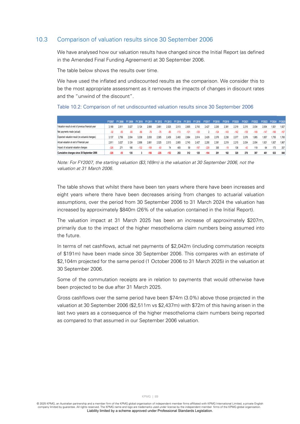 KPMG | 89 © 2025 KPMG, an Australian partnership and a member firm of the KPMG global organisation of independent member firms affiliated with KPMG International Limited, a private English company limited by guarantee. All rights reserved. The KPMG name and logo are trademarks used under license by the independent member firms of the KPMG global organisation. Liability limited by a scheme approved under Professional Standards Legislation. 10.3 Comparison of valuation results since 30 September 2006 We have analysed how our valuation results have changed since the Initial Report (as defined in the Amended Final Funding Agreement) at 30 September 2006. The table below shows the results over time. We have used the inflated and undiscounted results as the comparison. We consider this to be the most appropriate assessment as it removes the impacts of changes in discount rates and the “unwind of the discount”. Table 10.2: Comparison of net undiscounted valuation results since 30 September 2006 Note: For FY2007, the starting valuation ($3,169m) is the valuation at 30 September 2006, not the valuation at 31 March 2006. The table shows that whilst there have been ten years where there have been increases and eight years where there have been decreases arising from changes to actuarial valuation assumptions, over the period from 30 September 2006 to 31 March 2024 the valuation has increased by approximately $840m (26% of the valuation contained in the Initial Report). The valuation impact at 31 March 2025 has been an increase of approximately $207m, primarily due to the impact of the higher mesothelioma claim numbers being assumed into the future. In terms of net cashflows, actual net payments of $2,042m (including commutation receipts of $191m) have been made since 30 September 2006. This compares with an estimate of $2,104m projected for the same period (1 October 2006 to 31 March 2025) in the valuation at 30 September 2006. Some of the commutation receipts are in relation to payments that would otherwise have been projected to be due after 31 March 2025. Gross cashflows over the same period have been $74m (3.0%) above those projected in the valuation at 30 September 2006 ($2,511m vs $2,437m) with $72m of this having arisen in the last two years as a consequence of the higher mesothelioma claim numbers being reported as compared to that assumed in our September 2006 valuation. FY2007 FY 2008 FY 2009 FY 2010 FY 2011 FY 2012 FY 2013 FY 2014 FY 2015 FY 2016 FY2017 FY2018 FY2019 FY2020 FY2021 FY2022 FY2023 FY2024 FY2025 Valuation result at end of previous financial year 3,169 2,811 3,027 3,124 2,906 2,661 2,525 2,513 2,805 2,743 2,427 2,200 2,381 2,219 2,215 2,034 2,004 1,921 1,927 Net payments made (actual) -32 -55 -93 -86 -76 -76 -86 -113 -121 -129 2 -124 -143 -142 -139 -149 -147 -166 -167 Expected valuation result (no actuarial changes) 3,137 2,756 2,934 3,038 2,830 2,585 2,439 2,400 2,684 2,614 2,429 2,076 2,238 2,077 2,076 1,885 1,857 1,755 1,760 Actual valuation at end of financial year 2,811 3,027 3,124 2,906 2,661 2,525 2,513 2,805 2,743 2,427 2,200 2,381 2,219 2,215 2,034 2,004 1,921 1,927 1,967 Impact of actuarial valuation changes -326 271 190 -132 -169 -60 74 405 59 -187 -229 305 -19 138 -42 119 64 173 207 Cumulative changes since 30 September 2006 -326 -55 135 3 -166 -226 -152 253 312 125 -104 201 182 320 278 397 461 633 840
