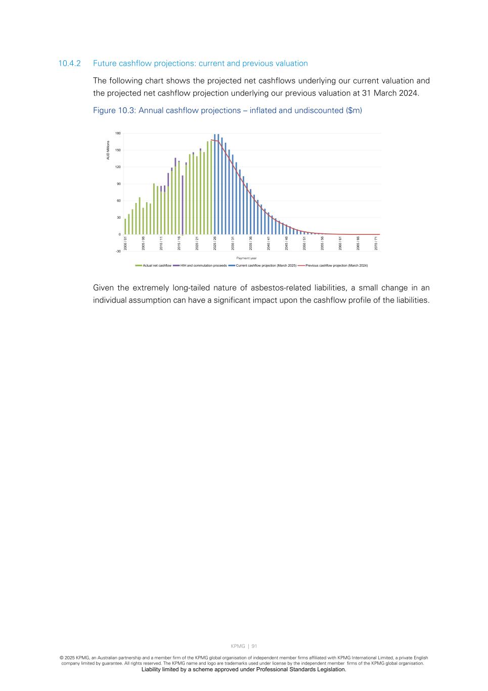 KPMG | 91 © 2025 KPMG, an Australian partnership and a member firm of the KPMG global organisation of independent member firms affiliated with KPMG International Limited, a private English company limited by guarantee. All rights reserved. The KPMG name and logo are trademarks used under license by the independent member firms of the KPMG global organisation. Liability limited by a scheme approved under Professional Standards Legislation. 10.4.2 Future cashflow projections: current and previous valuation The following chart shows the projected net cashflows underlying our current valuation and the projected net cashflow projection underlying our previous valuation at 31 March 2024. Figure 10.3: Annual cashflow projections – inflated and undiscounted ($m) Given the extremely long-tailed nature of asbestos-related liabilities, a small change in an individual assumption can have a significant impact upon the cashflow profile of the liabilities. -30 0 30 60 90 120 150 180 20 00 / 01 20 05 / 06 20 10 / 11 20 15 / 16 20 20 / 21 20 25 / 26 20 30 / 31 20 35 / 36 20 40 / 41 20 45 / 46 20 50 / 51 20 55 / 56 20 60 / 61 20 65 / 66 20 70 / 71 AU D M illi on s Payment year Actual net cashflow HIH and commutation proceeds Current cashflow projection (March 2025) Previous cashflow projection (March 2024)