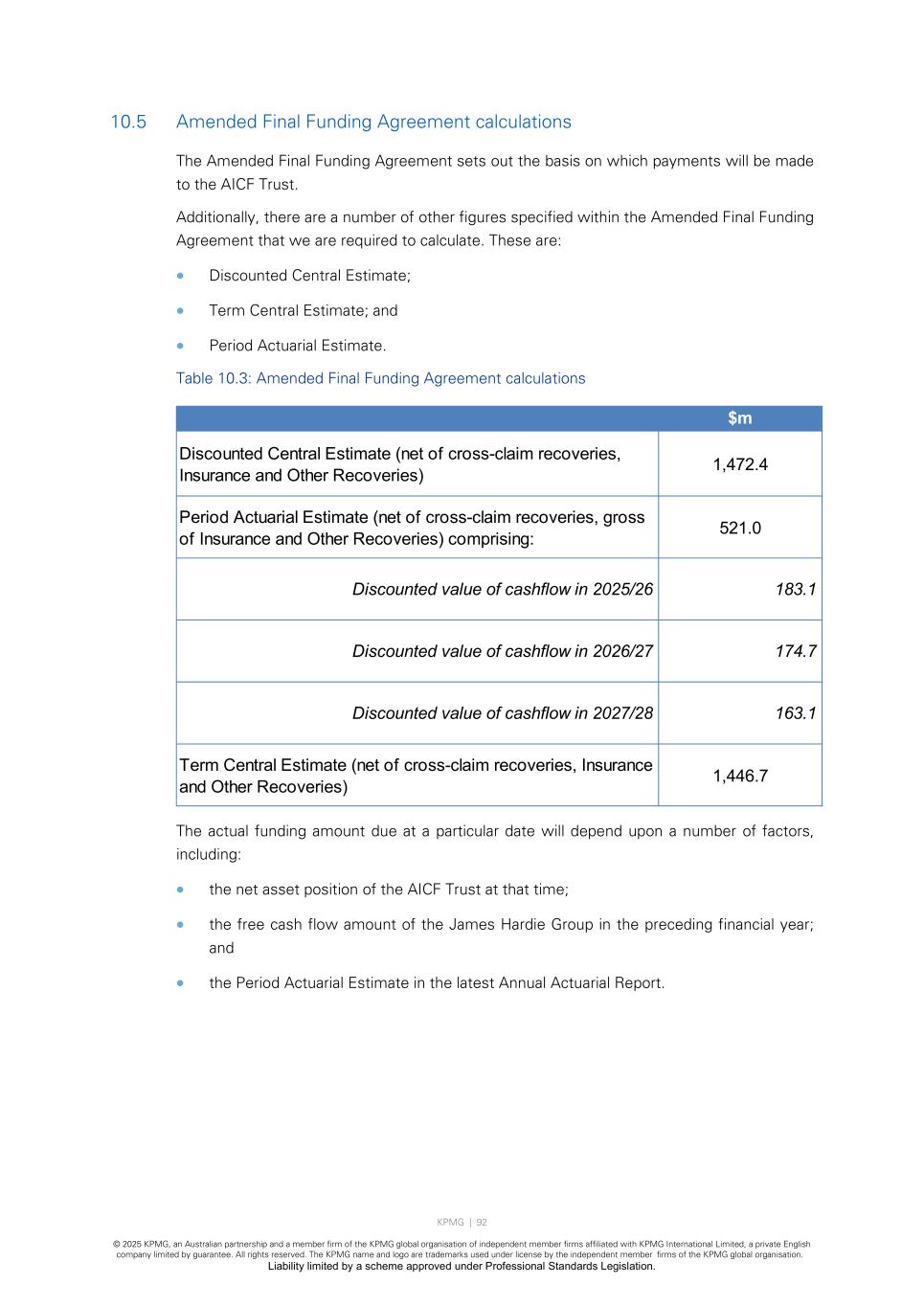 KPMG | 92 © 2025 KPMG, an Australian partnership and a member firm of the KPMG global organisation of independent member firms affiliated with KPMG International Limited, a private English company limited by guarantee. All rights reserved. The KPMG name and logo are trademarks used under license by the independent member firms of the KPMG global organisation. Liability limited by a scheme approved under Professional Standards Legislation. 10.5 Amended Final Funding Agreement calculations The Amended Final Funding Agreement sets out the basis on which payments will be made to the AICF Trust. Additionally, there are a number of other figures specified within the Amended Final Funding Agreement that we are required to calculate. These are: • Discounted Central Estimate; • Term Central Estimate; and • Period Actuarial Estimate. Table 10.3: Amended Final Funding Agreement calculations The actual funding amount due at a particular date will depend upon a number of factors, including: • the net asset position of the AICF Trust at that time; • the free cash flow amount of the James Hardie Group in the preceding financial year; and • the Period Actuarial Estimate in the latest Annual Actuarial Report. $m Discounted Central Estimate (net of cross-claim recoveries, Insurance and Other Recoveries) 1,472.4 Period Actuarial Estimate (net of cross-claim recoveries, gross of Insurance and Other Recoveries) comprising: 521.0 Discounted value of cashflow in 2025/26 183.1 Discounted value of cashflow in 2026/27 174.7 Discounted value of cashflow in 2027/28 163.1 Term Central Estimate (net of cross-claim recoveries, Insurance and Other Recoveries) 1,446.7