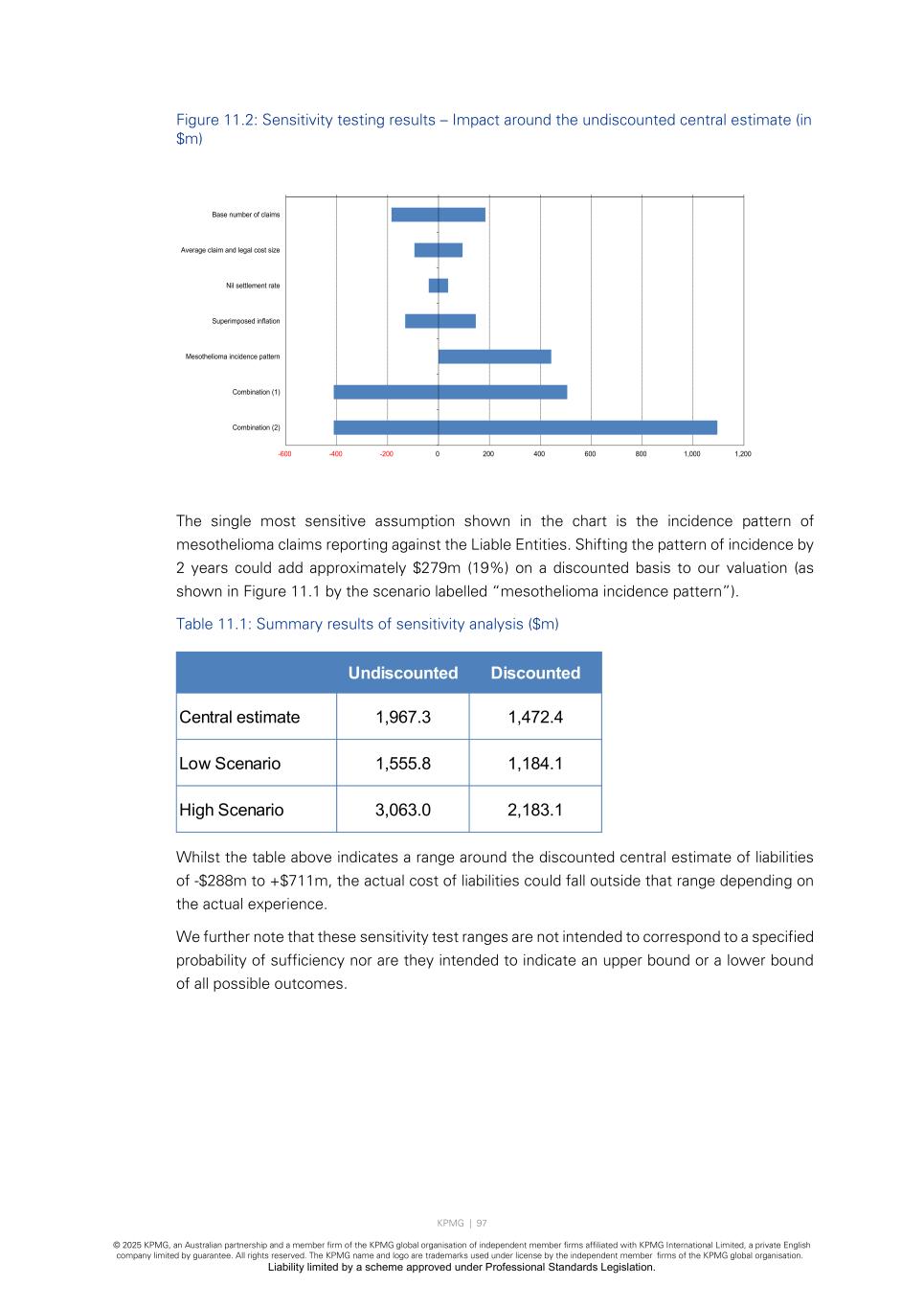 KPMG | 97 © 2025 KPMG, an Australian partnership and a member firm of the KPMG global organisation of independent member firms affiliated with KPMG International Limited, a private English company limited by guarantee. All rights reserved. The KPMG name and logo are trademarks used under license by the independent member firms of the KPMG global organisation. Liability limited by a scheme approved under Professional Standards Legislation. Figure 11.2: Sensitivity testing results – Impact around the undiscounted central estimate (in $m) The single most sensitive assumption shown in the chart is the incidence pattern of mesothelioma claims reporting against the Liable Entities. Shifting the pattern of incidence by 2 years could add approximately $279m (19%) on a discounted basis to our valuation (as shown in Figure 11.1 by the scenario labelled “mesothelioma incidence pattern”). Table 11.1: Summary results of sensitivity analysis ($m) Whilst the table above indicates a range around the discounted central estimate of liabilities of -$288m to +$711m, the actual cost of liabilities could fall outside that range depending on the actual experience. We further note that these sensitivity test ranges are not intended to correspond to a specified probability of sufficiency nor are they intended to indicate an upper bound or a lower bound of all possible outcomes. -600 -400 -200 0 200 400 600 800 1,000 1,200 Base number of claims Average claim and legal cost size Nil settlement rate Superimposed inflation Mesothelioma incidence pattern Combination (1) Combination (2) Undiscounted Discounted Central estimate 1,967.3 1,472.4 Low Scenario 1,555.8 1,184.1 High Scenario 3,063.0 2,183.1