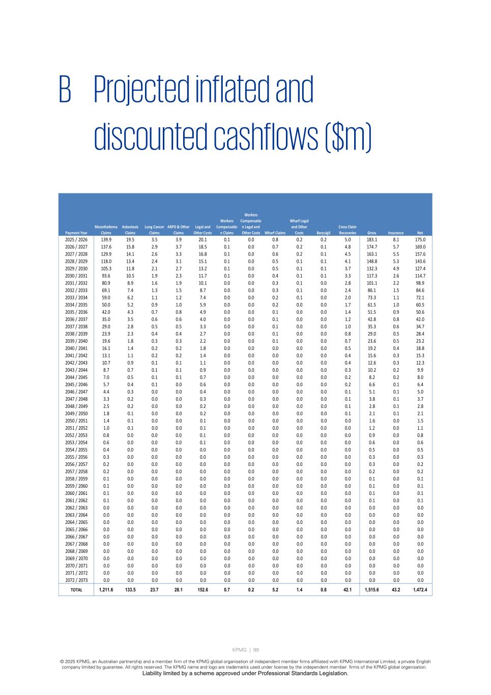 KPMG | 98 © 2025 KPMG, an Australian partnership and a member firm of the KPMG global organisation of independent member firms affiliated with KPMG International Limited, a private English company limited by guarantee. All rights reserved. The KPMG name and logo are trademarks used under license by the independent member firms of the KPMG global organisation. Liability limited by a scheme approved under Professional Standards Legislation. A Projected inflated and undiscounted cashflows ($m) Payment Year Mesothelioma Claims Asbestosis Claims Lung Cancer Claims ARPD & Other Claims Legal and Other Costs Workers Compensatio n Claims Workers Compensatio n Legal and Other Costs Wharf Claims Wharf Legal and Other Costs Baryulgil Cross Claim Recoveries Gross Insurance Net 2025 / 2026 142.5 19.8 3.5 4.0 20.5 0.1 0.0 0.9 0.2 0.2 5.1 186.6 8.3 178.4 2026 / 2027 145.4 16.7 3.0 3.9 19.5 0.1 0.0 0.7 0.2 0.1 5.1 184.7 6.0 178.7 2027 / 2028 142.2 15.5 2.8 3.6 18.4 0.1 0.0 0.6 0.2 0.1 4.9 178.6 6.1 172.5 2028 / 2029 134.2 15.3 2.8 3.6 17.1 0.1 0.0 0.6 0.2 0.1 4.7 169.2 6.0 163.2 2029 / 2030 124.8 14.0 2.5 3.2 15.7 0.1 0.0 0.6 0.1 0.1 4.4 156.7 5.8 150.9 2030 / 2031 116.0 12.9 2.3 2.8 14.5 0.1 0.0 0.5 0.1 0.1 4.0 145.3 3.2 142.0 2031 / 2032 105.1 11.6 2.1 2.5 13.1 0.1 0.0 0.4 0.1 0.1 3.7 131.3 2.8 128.5 2032 / 2033 94.4 10.1 1.8 2.1 11.8 0.0 0.0 0.4 0.1 0.1 3.3 117.5 2.0 115.5 2033 / 2034 84.8 9.0 1.6 1.8 10.6 0.0 0.0 0.3 0.1 0.0 2.9 105.3 1.6 103.6 2034 / 2035 75.6 7.9 1.4 1.5 8.9 0.0 0.0 0.3 0.1 0.0 2.6 93.1 1.5 91.6 2035 / 2036 67.0 6.8 1.2 1.3 7.8 0.0 0.0 0.2 0.1 0.0 2.3 82.1 1.4 80.7 2036 / 2037 58.9 5.9 1.0 1.0 6.8 0.0 0.0 0.2 0.0 0.0 2.0 72.0 1.3 70.7 2037 / 2038 51.5 5.0 0.8 0.9 5.9 0.0 0.0 0.2 0.0 0.0 1.8 62.7 1.1 61.5 2038 / 2039 44.8 4.3 0.7 0.7 5.0 0.0 0.0 0.1 0.0 0.0 1.5 54.2 1.0 53.2 2039 / 2040 38.8 3.6 0.6 0.6 4.3 0.0 0.0 0.1 0.0 0.0 1.3 46.7 0.9 45.8 2040 / 2041 33.5 3.0 0.5 0.5 3.7 0.0 0.0 0.1 0.0 0.0 1.1 40.1 0.8 39.3 2041 / 2042 28.9 2.5 0.4 0.4 3.1 0.0 0.0 0.1 0.0 0.0 1.0 34.3 0.7 33.6 2042 / 2043 24.8 2.0 0.3 0.3 2.6 0.0 0.0 0.1 0.0 0.0 0.8 29.3 0.6 28.7 2043 / 2044 21.3 1.6 0.3 0.2 2.2 0.0 0.0 0.0 0.0 0.0 0.7 25.0 0.5 24.4 2044 / 2045 18.2 1.3 0.2 0.2 1.9 0.0 0.0 0.0 0.0 0.0 0.6 21.2 0.5 20.8 2045 / 2046 15.6 1.0 0.2 0.1 1.6 0.0 0.0 0.0 0.0 0.0 0.5 18.0 0.4 17.6 2046 / 2047 12.8 0.8 0.1 0.1 1.3 0.0 0.0 0.0 0.0 0.0 0.4 14.8 0.3 14.4 2047 / 2048 10.2 0.6 0.1 0.1 1.0 0.0 0.0 0.0 0.0 0.0 0.3 11.7 0.3 11.4 2048 / 2049 8.0 0.5 0.1 0.1 0.8 0.0 0.0 0.0 0.0 0.0 0.3 9.2 0.2 9.0 2049 / 2050 6.3 0.4 0.1 0.0 0.6 0.0 0.0 0.0 0.0 0.0 0.2 7.2 0.2 7.0 2050 / 2051 4.9 0.3 0.0 0.0 0.5 0.0 0.0 0.0 0.0 0.0 0.2 5.6 0.1 5.5 2051 / 2052 3.9 0.2 0.0 0.0 0.4 0.0 0.0 0.0 0.0 0.0 0.1 4.4 0.1 4.3 2052 / 2053 3.0 0.2 0.0 0.0 0.3 0.0 0.0 0.0 0.0 0.0 0.1 3.4 0.1 3.3 2053 / 2054 2.4 0.1 0.0 0.0 0.2 0.0 0.0 0.0 0.0 0.0 0.1 2.7 0.1 2.6 2054 / 2055 1.9 0.1 0.0 0.0 0.2 0.0 0.0 0.0 0.0 0.0 0.1 2.1 0.1 2.0 2055 / 2056 1.5 0.1 0.0 0.0 0.1 0.0 0.0 0.0 0.0 0.0 0.0 1.6 0.0 1.6 2056 / 2057 1.1 0.0 0.0 0.0 0.1 0.0 0.0 0.0 0.0 0.0 0.0 1.3 0.0 1.2 2057 / 2058 0.9 0.0 0.0 0.0 0.1 0.0 0.0 0.0 0.0 0.0 0.0 1.0 0.0 1.0 2058 / 2059 0.7 0.0 0.0 0.0 0.1 0.0 0.0 0.0 0.0 0.0 0.0 0.8 0.0 0.8 2059 / 2060 0.6 0.0 0.0 0.0 0.0 0.0 0.0 0.0 0.0 0.0 0.0 0.6 0.0 0.6 2060 / 2061 0.4 0.0 0.0 0.0 0.0 0.0 0.0 0.0 0.0 0.0 0.0 0.5 0.0 0.5 2061 / 2062 0.3 0.0 0.0 0.0 0.0 0.0 0.0 0.0 0.0 0.0 0.0 0.4 0.0 0.4 2062 / 2063 0.3 0.0 0.0 0.0 0.0 0.0 0.0 0.0 0.0 0.0 0.0 0.3 0.0 0.3 2063 / 2064 0.1 0.0 0.0 0.0 0.0 0.0 0.0 0.0 0.0 0.0 0.0 0.1 0.0 0.1 2064 / 2065 0.0 0.0 0.0 0.0 0.0 0.0 0.0 0.0 0.0 0.0 0.0 0.0 0.0 0.0 2065 / 2066 0.0 0.0 0.0 0.0 0.0 0.0 0.0 0.0 0.0 0.0 0.0 0.0 0.0 0.0 2066 / 2067 0.0 0.0 0.0 0.0 0.0 0.0 0.0 0.0 0.0 0.0 0.0 0.0 0.0 0.0 2067 / 2068 0.0 0.0 0.0 0.0 0.0 0.0 0.0 0.0 0.0 0.0 0.0 0.0 0.0 0.0 2068 / 2069 0.0 0.0 0.0 0.0 0.0 0.0 0.0 0.0 0.0 0.0 0.0 0.0 0.0 0.0 2069 / 2070 0.0 0.0 0.0 0.0 0.0 0.0 0.0 0.0 0.0 0.0 0.0 0.0 0.0 0.0 2070 / 2071 0.0 0.0 0.0 0.0 0.0 0.0 0.0 0.0 0.0 0.0 0.0 0.0 0.0 0.0 2071 / 2072 0.0 0.0 0.0 0.0 0.0 0.0 0.0 0.0 0.0 0.0 0.0 0.0 0.0 0.0 2072 / 2073 0.0 0.0 0.0 0.0 0.0 0.0 0.0 0.0 0.0 0.0 0.0 0.0 0.0 0.0 TOTAL 1,628.0 173.1 30.4 35.4 200.5 0.8 0.3 6.5 1.7 1.0 56.2 2,021.6 54.3 1,967.3