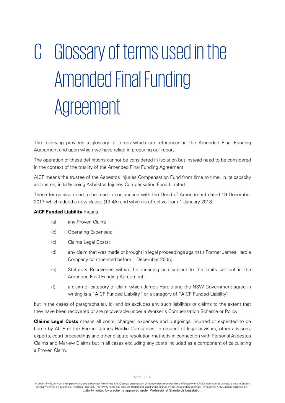 KPMG | 100 © 2025 KPMG, an Australian partnership and a member firm of the KPMG global organisation of independent member firms affiliated with KPMG International Limited, a private English company limited by guarantee. All rights reserved. The KPMG name and logo are trademarks used under license by the independent member firms of the KPMG global organisation. Liability limited by a scheme approved under Professional Standards Legislation. C Glossary of terms used in the Amended Final Funding Agreement The following provides a glossary of terms which are referenced in the Amended Final Funding Agreement and upon which we have relied in preparing our report. The operation of these definitions cannot be considered in isolation but instead need to be considered in the context of the totality of the Amended Final Funding Agreement. AICF means the trustee of the Asbestos Injuries Compensation Fund from time to time, in its capacity as trustee, initially being Asbestos Injuries Compensation Fund Limited. These terms also need to be read in conjunction with the Deed of Amendment dated 19 December 2017 which added a new clause (13.4A) and which is effective from 1 January 2018. AICF Funded Liability means: (a) any Proven Claim; (b) Operating Expenses; (c) Claims Legal Costs; (d) any claim that was made or brought in legal proceedings against a Former James Hardie Company commenced before 1 December 2005; (e) Statutory Recoveries within the meaning and subject to the limits set out in the Amended Final Funding Agreement; (f) a claim or category of claim which James Hardie and the NSW Government agree in writing is a “AICF Funded Liability” or a category of “AICF Funded Liability". but in the cases of paragraphs (a), (c) and (d) excludes any such liabilities or claims to the extent that they have been recovered or are recoverable under a Worker’s Compensation Scheme or Policy. Claims Legal Costs means all costs, charges, expenses and outgoings incurred or expected to be borne by AICF or the Former James Hardie Companies, in respect of legal advisors, other advisors, experts, court proceedings and other dispute resolution methods in connection with Personal Asbestos Claims and Marlew Claims but in all cases excluding any costs included as a component of calculating a Proven Claim.