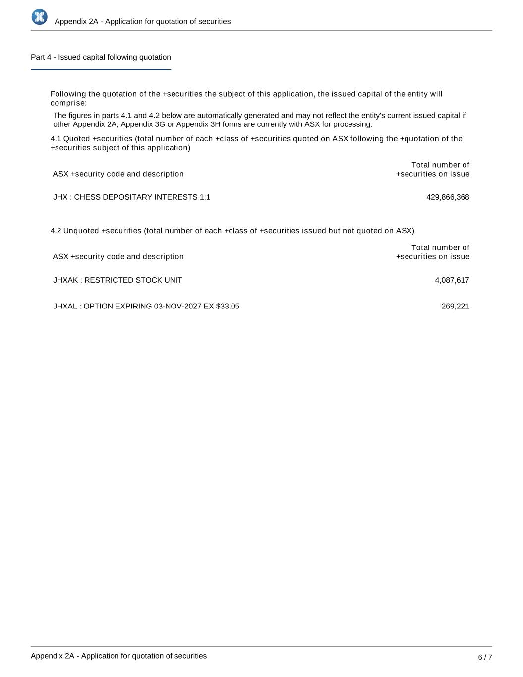 Appendix 2A - Application for quotation of securities Appendix 2A - Application for quotation of securities 6 / 7 Part 4 - Issued capital following quotation Following the quotation of the +securities the subject of this application, the issued capital of the entity will comprise: The figures in parts 4.1 and 4.2 below are automatically generated and may not reflect the entity's current issued capital if other Appendix 2A, Appendix 3G or Appendix 3H forms are currently with ASX for processing. 4.1 Quoted +securities (total number of each +class of +securities quoted on ASX following the +quotation of the +securities subject of this application) ASX +security code and description Total number of +securities on issue JHX : CHESS DEPOSITARY INTERESTS 1:1 429,866,368 4.2 Unquoted +securities (total number of each +class of +securities issued but not quoted on ASX) ASX +security code and description Total number of +securities on issue JHXAK : RESTRICTED STOCK UNIT 4,087,617 JHXAL : OPTION EXPIRING 03-NOV-2027 EX $33.05 269,221