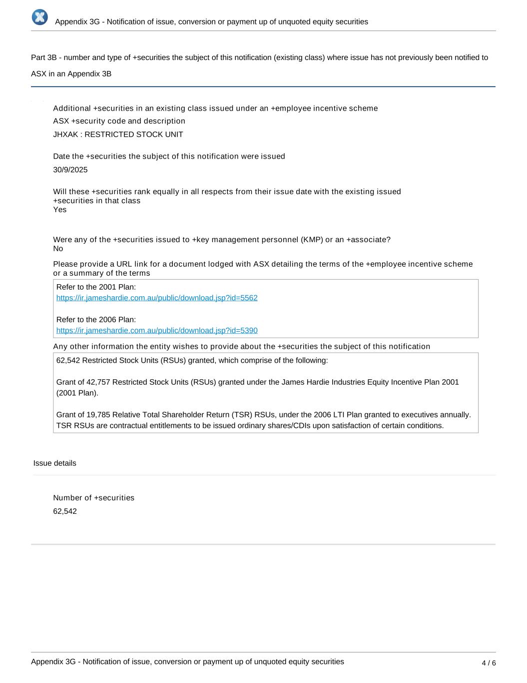 Appendix 3G - Notification of issue, conversion or payment up of unquoted equity securities Appendix 3G - Notification of issue, conversion or payment up of unquoted equity securities 4 / 6 Part 3B - number and type of +securities the subject of this notification (existing class) where issue has not previously been notified to ASX in an Appendix 3B Additional +securities in an existing class issued under an +employee incentive scheme ASX +security code and description JHXAK : RESTRICTED STOCK UNIT Date the +securities the subject of this notification were issued 30/9/2025 Will these +securities rank equally in all respects from their issue date with the existing issued +securities in that class Were any of the +securities issued to +key management personnel (KMP) or an +associate? Please provide a URL link for a document lodged with ASX detailing the terms of the +employee incentive scheme or a summary of the terms Refer to the 2001 Plan: https://ir.jameshardie.com.au/public/download.jsp?id=5562 Refer to the 2006 Plan: https://ir.jameshardie.com.au/public/download.jsp?id=5390 Any other information the entity wishes to provide about the +securities the subject of this notification 62,542 Restricted Stock Units (RSUs) granted, which comprise of the following: Grant of 42,757 Restricted Stock Units (RSUs) granted under the James Hardie Industries Equity Incentive Plan 2001 (2001 Plan). Grant of 19,785 Relative Total Shareholder Return (TSR) RSUs, under the 2006 LTI Plan granted to executives annually. TSR RSUs are contractual entitlements to be issued ordinary shares/CDIs upon satisfaction of certain conditions. Issue details Number of +securities 62,542 No Yes