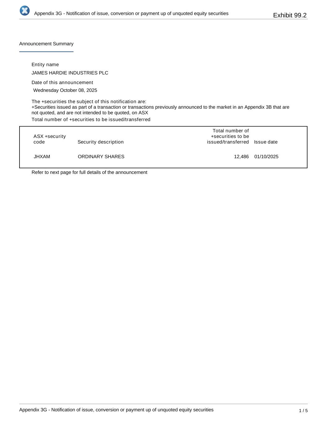 Appendix 3G - Notification of issue, conversion or payment up of unquoted equity securities Appendix 3G - Notification of issue, conversion or payment up of unquoted equity securities 1 / 5 Announcement Summary Entity name JAMES HARDIE INDUSTRIES PLC Date of this announcement Wednesday October 08, 2025 The +securities the subject of this notification are: Total number of +securities to be issued/transferred ASX +security code Security description Total number of +securities to be issued/transferred Issue date JHXAM ORDINARY SHARES 12,486 01/10/2025 Refer to next page for full details of the announcement +Securities issued as part of a transaction or transactions previously announced to the market in an Appendix 3B that are not quoted, and are not intended to be quoted, on ASX