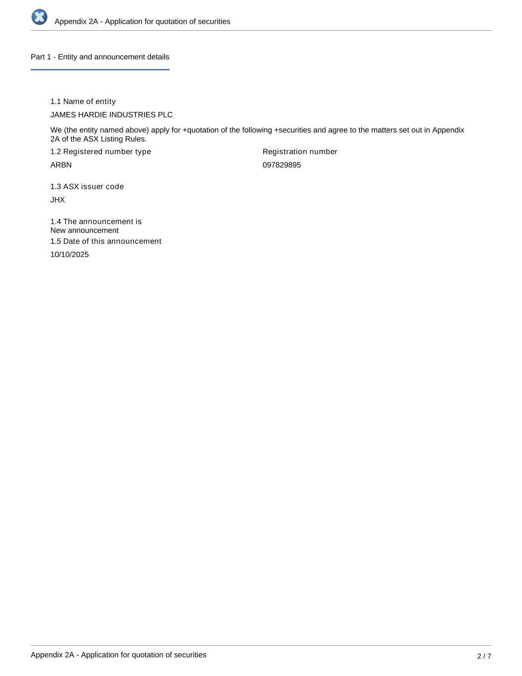 Appendix 2A - Application for quotation of securities Appendix 2A - Application for quotation of securities 2 / 7 Part 1 - Entity and announcement details 1.1 Name of entity JAMES HARDIE INDUSTRIES PLC We (the entity named above) apply for +quotation of the following +securities and agree to the matters set out in Appendix 2A of the ASX Listing Rules. 1.2 Registered number type ARBN Registration number 097829895 1.3 ASX issuer code JHX 1.4 The announcement is 1.5 Date of this announcement 10/10/2025 New announcement