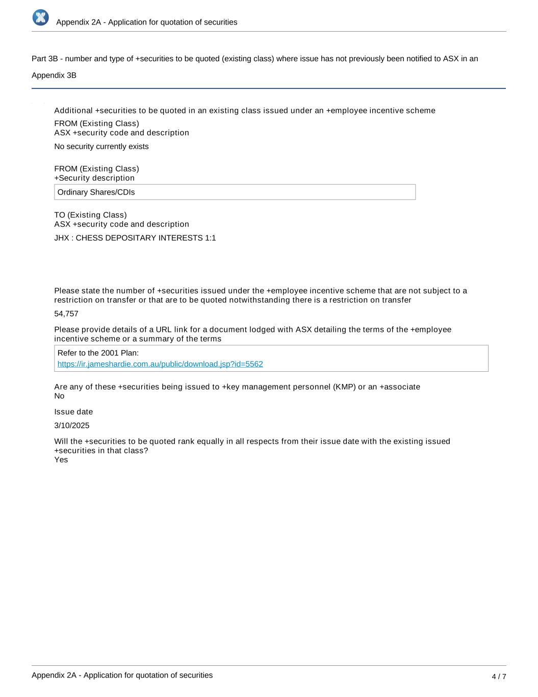 Appendix 2A - Application for quotation of securities Appendix 2A - Application for quotation of securities 4 / 7 Part 3B - number and type of +securities to be quoted (existing class) where issue has not previously been notified to ASX in an Appendix 3B Additional +securities to be quoted in an existing class issued under an +employee incentive scheme FROM (Existing Class) ASX +security code and description No security currently exists FROM (Existing Class) +Security description Ordinary Shares/CDIs TO (Existing Class) ASX +security code and description JHX : CHESS DEPOSITARY INTERESTS 1:1 Please state the number of +securities issued under the +employee incentive scheme that are not subject to a restriction on transfer or that are to be quoted notwithstanding there is a restriction on transfer 54,757 Please provide details of a URL link for a document lodged with ASX detailing the terms of the +employee incentive scheme or a summary of the terms Refer to the 2001 Plan: https://ir.jameshardie.com.au/public/download.jsp?id=5562 Are any of these +securities being issued to +key management personnel (KMP) or an +associate Issue date 3/10/2025 Will the +securities to be quoted rank equally in all respects from their issue date with the existing issued +securities in that class? Yes No