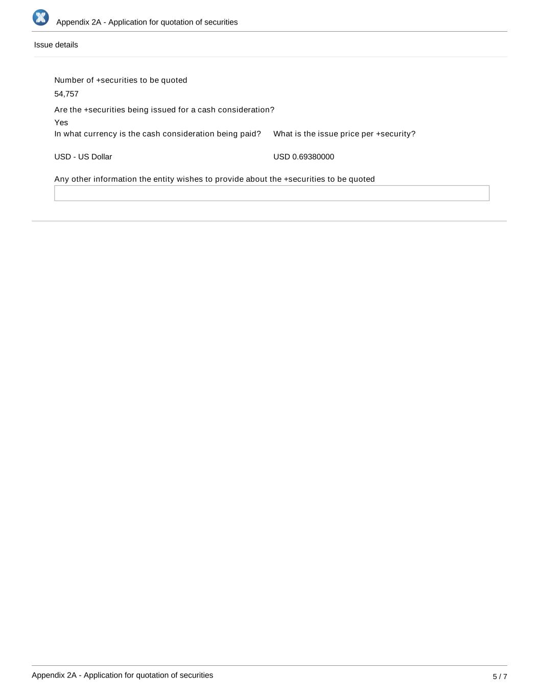Appendix 2A - Application for quotation of securities Appendix 2A - Application for quotation of securities 5 / 7 Issue details Number of +securities to be quoted 54,757 Are the +securities being issued for a cash consideration? In what currency is the cash consideration being paid? USD - US Dollar What is the issue price per +security? USD 0.69380000 Any other information the entity wishes to provide about the +securities to be quoted Yes