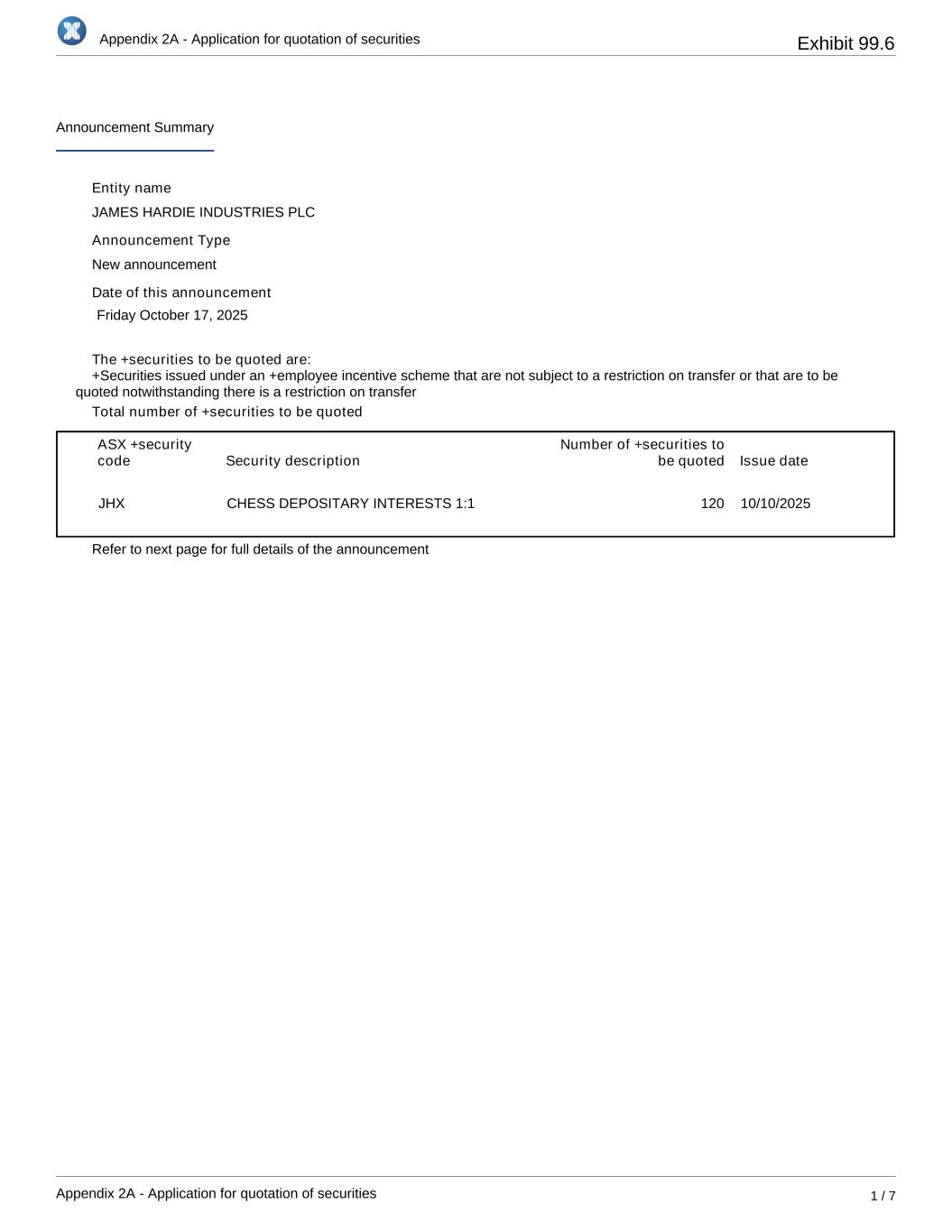 Appendix 2A - Application for quotation of securities Appendix 2A - Application for quotation of securities 1 / 7 Announcement Summary Entity name JAMES HARDIE INDUSTRIES PLC Announcement Type New announcement Date of this announcement Friday October 17, 2025 The +securities to be quoted are: Total number of +securities to be quoted ASX +security code Security description Number of +securities to be quoted Issue date JHX CHESS DEPOSITARY INTERESTS 1:1 120 10/10/2025 Refer to next page for full details of the announcement +Securities issued under an +employee incentive scheme that are not subject to a restriction on transfer or that are to be quoted notwithstanding there is a restriction on transfer