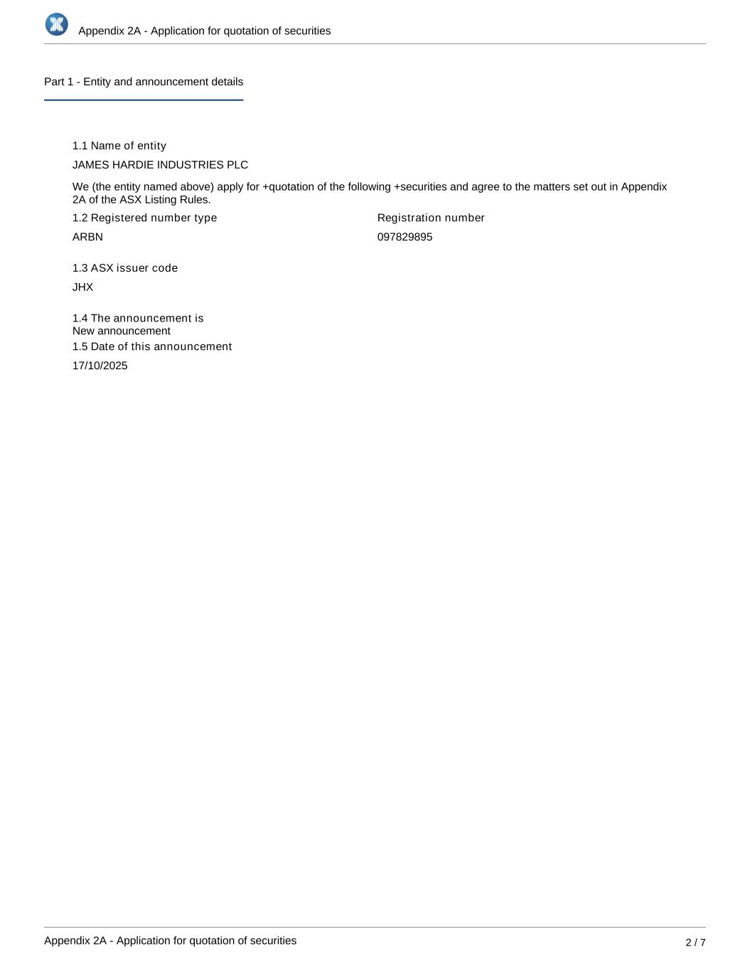 Appendix 2A - Application for quotation of securities Appendix 2A - Application for quotation of securities 2 / 7 Part 1 - Entity and announcement details 1.1 Name of entity JAMES HARDIE INDUSTRIES PLC We (the entity named above) apply for +quotation of the following +securities and agree to the matters set out in Appendix 2A of the ASX Listing Rules. 1.2 Registered number type ARBN Registration number 097829895 1.3 ASX issuer code JHX 1.4 The announcement is 1.5 Date of this announcement 17/10/2025 New announcement