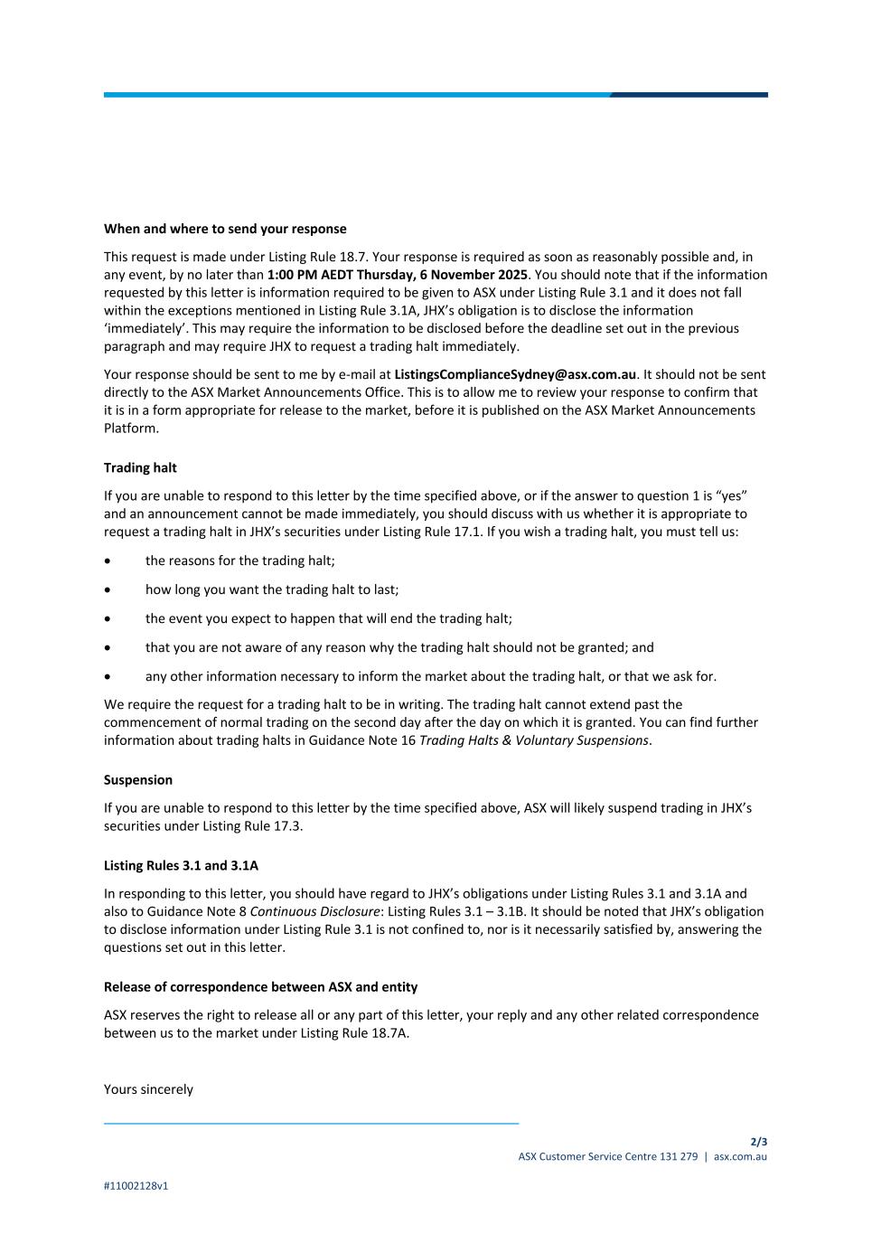 ASX Limited [[Listings]] ASX Customer Service Centre 131 279 | asx.com.au #11002128v1 6 November 2025 Reference: 114476 Ms Aoife Rockett Company Secretary James Hardie Industries Plc Level 20 60 Castlereagh Street Sydney NSW 2000 By email Dear Ms Rockett James Hardie Industries Plc (‘JHX’): Price - Query ASX refers to the following: A. The change in the price of JHX’s securities from a close of $29.48 on 5 November 2025 to a low of $24.41 at the time of writing today. B. The significant increase in the volume of JHX’s securities traded today. Request for information In light of this, ASX asks JHX to respond separately to each of the following questions and requests for information: 1. Is JHX aware of any information concerning it that has not been announced to the market which, if known by some in the market, could explain the recent trading in its securities? 2. If the answer to question 1 is “yes”. (a) Is JHX relying on Listing Rule 3.1A not to announce that information under Listing Rule 3.1? Please note that the recent trading in JHX’s securities would suggest to ASX that such information may have ceased to be confidential and therefore JHX may no longer be able to rely on Listing Rule 3.1A. Accordingly, if the answer to this question is “yes”, you need to contact us immediately to discuss the situation. (b) Can an announcement be made immediately? Please note, if the answer to this question is “no”, you need to contact us immediately to discuss requesting a trading halt (see below). (c) If an announcement cannot be made immediately, why not and when is it expected that an announcement will be made? 3. If the answer to question 1 is “no”, is there any other explanation that JHX may have for the recent trading in its securities? 4. Please confirm that JHX is complying with the Listing Rules and, in particular, Listing Rule 3.1. 5. Please confirm that JHX’s responses to the questions above have been authorised and approved under its published continuous disclosure policy or otherwise by its board or an officer of JHX with delegated authority from the board to respond to ASX on disclosure matters.