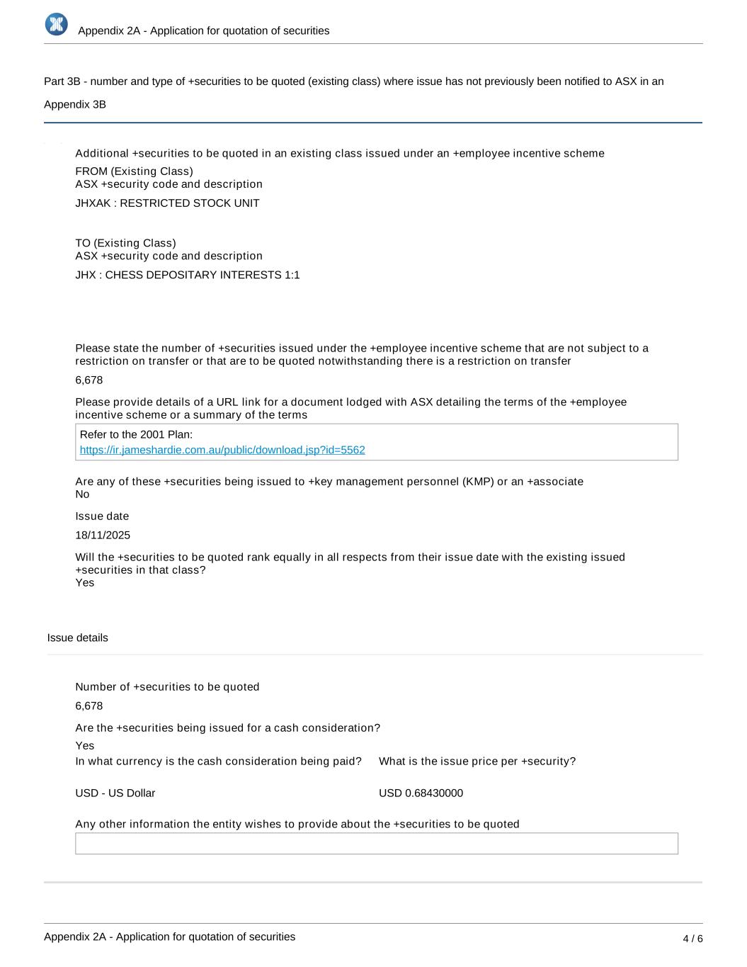 Appendix 2A - Application for quotation of securities Appendix 2A - Application for quotation of securities 4 / 6 Part 3B - number and type of +securities to be quoted (existing class) where issue has not previously been notified to ASX in an Appendix 3B Additional +securities to be quoted in an existing class issued under an +employee incentive scheme FROM (Existing Class) ASX +security code and description JHXAK : RESTRICTED STOCK UNIT TO (Existing Class) ASX +security code and description JHX : CHESS DEPOSITARY INTERESTS 1:1 Please state the number of +securities issued under the +employee incentive scheme that are not subject to a restriction on transfer or that are to be quoted notwithstanding there is a restriction on transfer 6,678 Please provide details of a URL link for a document lodged with ASX detailing the terms of the +employee incentive scheme or a summary of the terms Refer to the 2001 Plan: https://ir.jameshardie.com.au/public/download.jsp?id=5562 Are any of these +securities being issued to +key management personnel (KMP) or an +associate Issue date 18/11/2025 Will the +securities to be quoted rank equally in all respects from their issue date with the existing issued +securities in that class? Issue details Number of +securities to be quoted 6,678 Are the +securities being issued for a cash consideration? In what currency is the cash consideration being paid? USD - US Dollar What is the issue price per +security? USD 0.68430000 Any other information the entity wishes to provide about the +securities to be quoted Yes Yes No